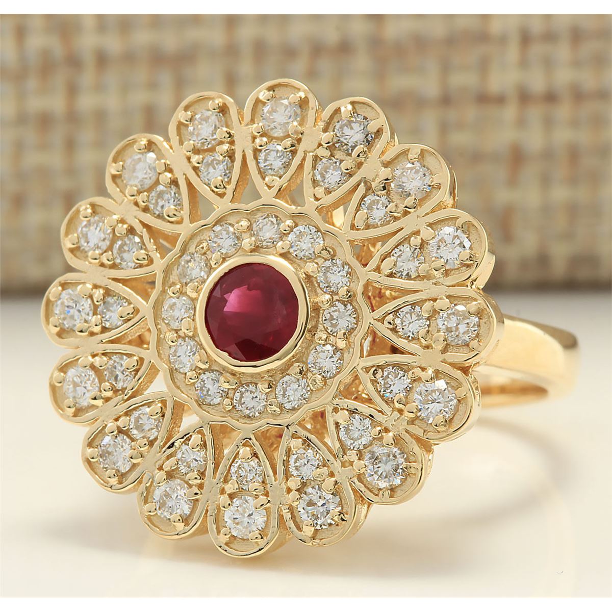 Stamped: 14K Ring Size: 6.5 Total Ring Weight: 8.2 Grams Diamond Weight: Total natural diamond weight is .90carat. SI1-SI2 clarity / G-H color Gemstone Weight: Total Natural Ruby Weight is .50ctw (Measures: 5.30x5.30mm) Main Stone Color: Red Face Measures: 21.12x20.63mm SKU: [703253]