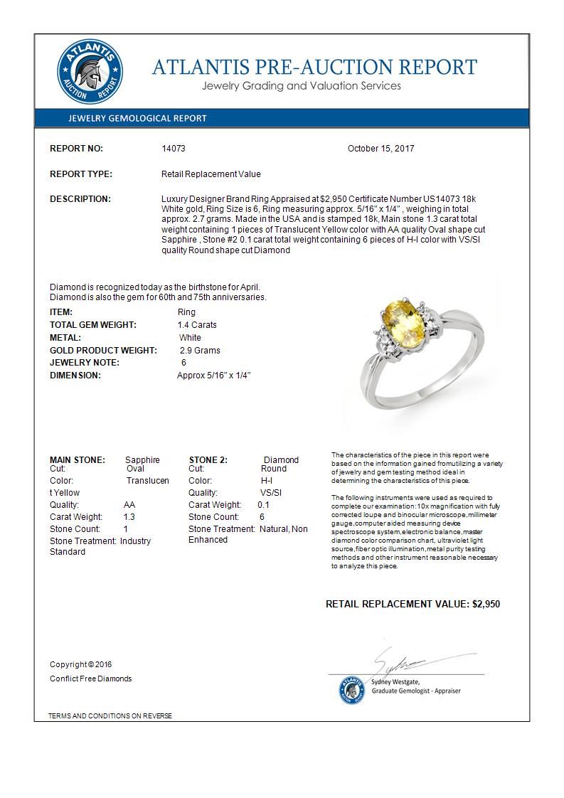 14073 - REF-40M9F ---- 1.40 CTW Yellow Sapphire & Diamond Ring 18K White Gold ---- Luxury Designer Brand Ring Appraised at $2,950 Certificate Number US14073 18k White gold, Ring Size is 6, Ring measuring approx. 5/16" x 1/4" , weighing in total approx. 2.7 grams. Made in the USA and is stamped 18k, Main stone 1.3 carat total weight containing 1 pieces of Translucent Yellow color with AA quality Oval shape cut Sapphire , Stone #2 0.1 carat total weight containing 6 pieces of H-I color with VS/SI quality Round shape cut Diamond