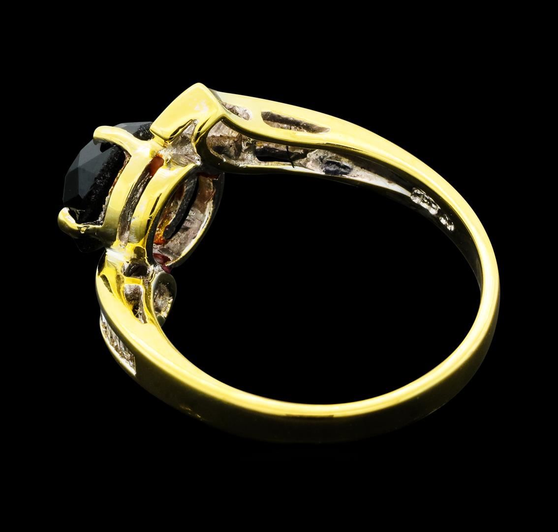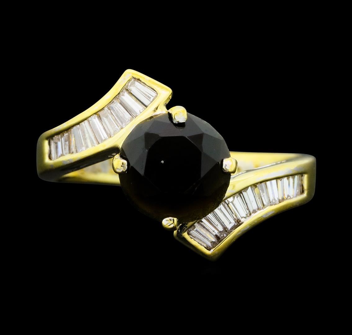 One electronically tested 14KT yellow gold lady's cast fashion ring with a bypass shank with a bright polish finish. The featured lady's ring has a shank measuring 2.56 millimeters wide. Condition is like new, good workmanship. Containing: Twenty-Two channel set baguette cut diamonds, measuring from 1.40 x 1.00 x 0.85mm (depth est.) to 2.20 x 1.20 x 1.02mm (depth est.) approximate total weight of 22 Stones = 0.40ct. Graded in the setting. Color H - I Clarity VS-2 to SI-1 Cut Good One prong set round faceted cabochon cut natural black onyx, measuring 7.52 x 7.39 x 2.90mm, (depth est.) approximate weight of 1.00ct., black, strong, black color, (GIA Bl 10/5), cut is good. Graded in the setting. Total Weight of Colored Stones 1.00ct.. Total Weight of Diamonds 0.40ct.. Total Weight of Ring 3.90gm. GAS Appraised at $1,925.00.