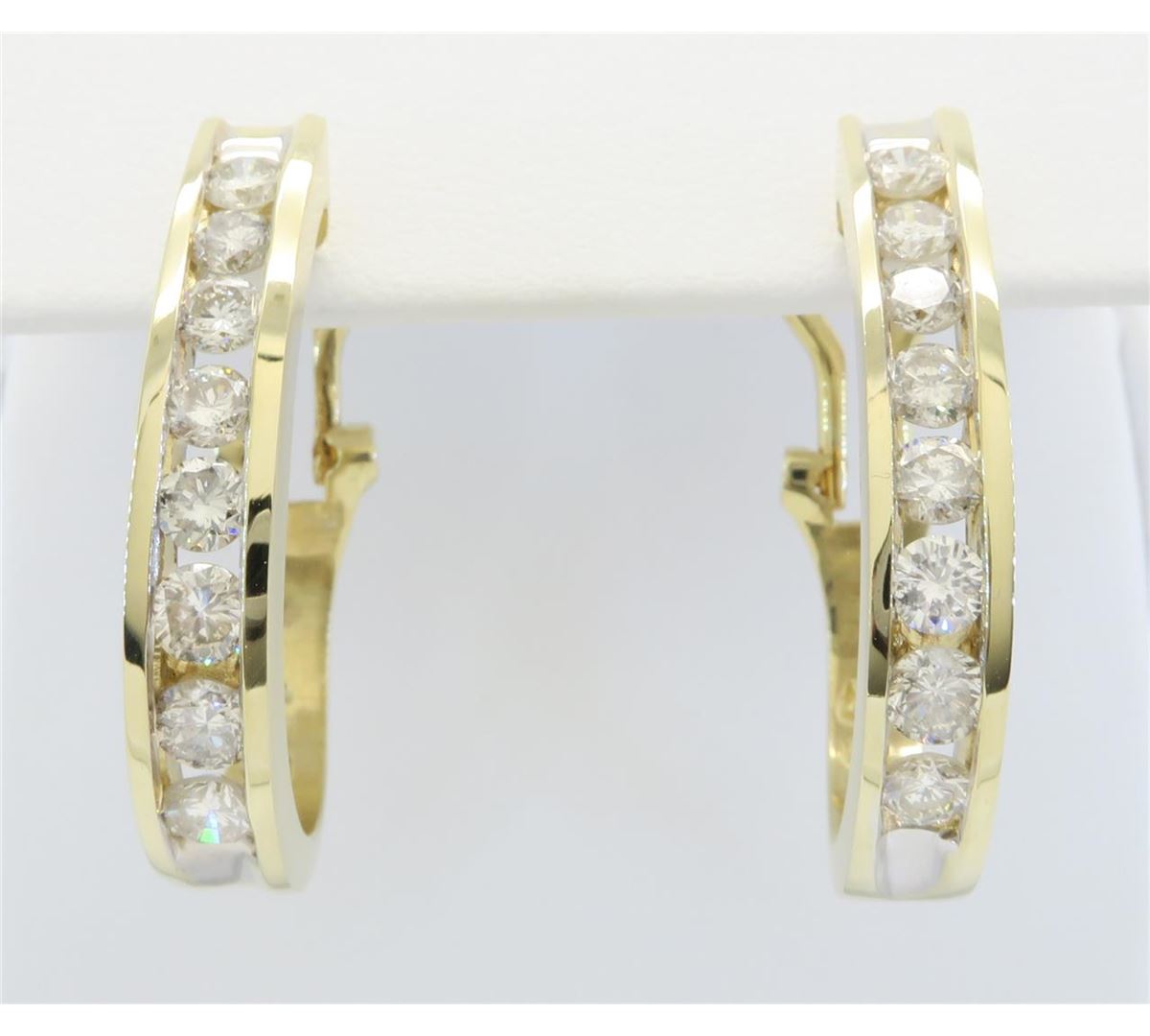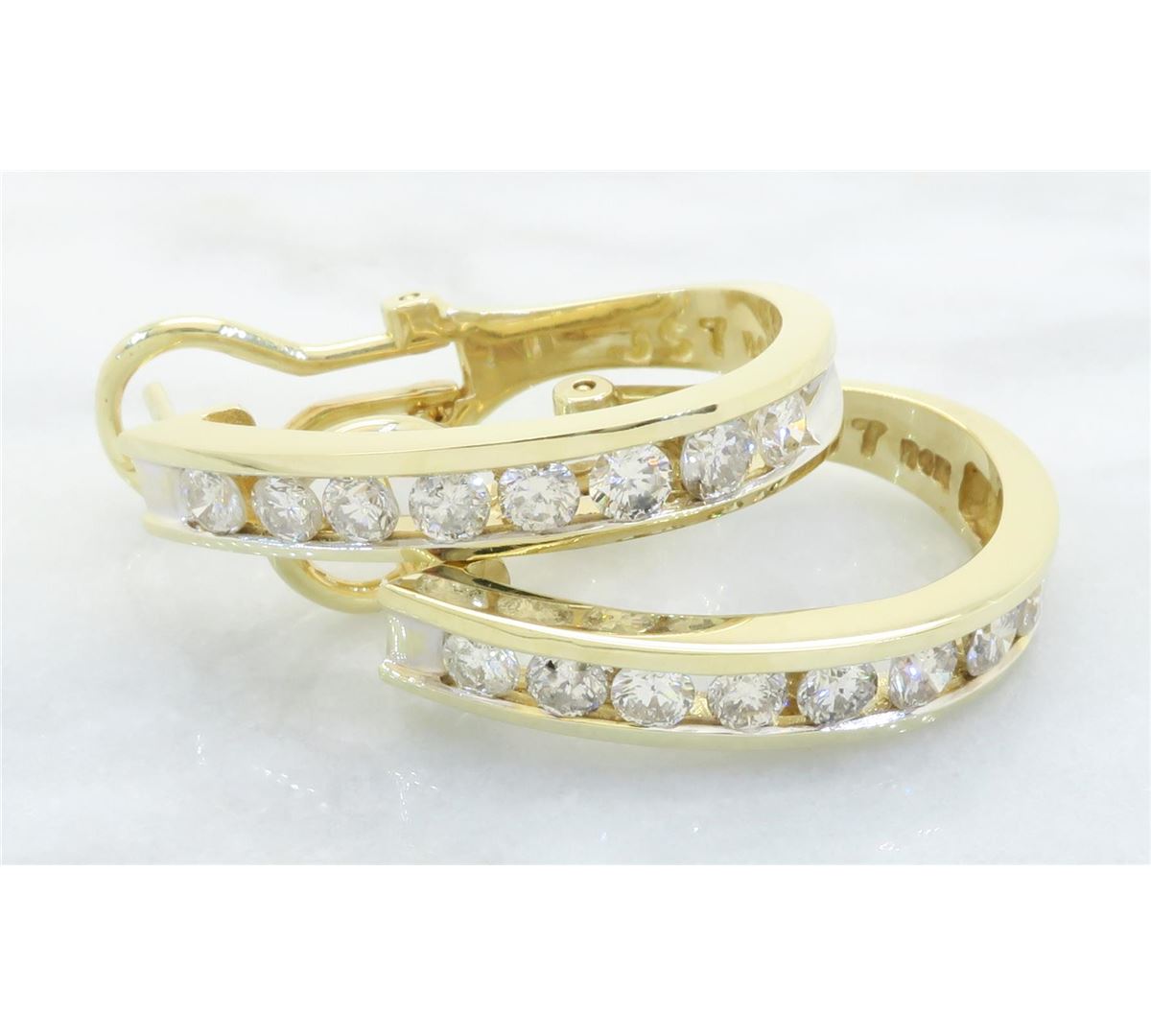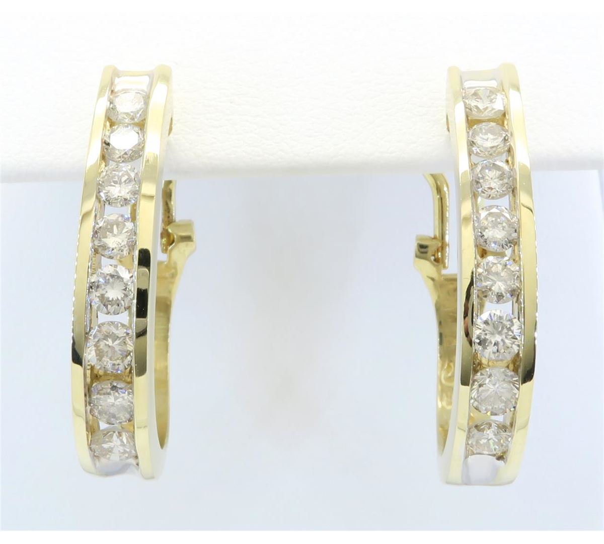 One pair of tested 14K Yellow Gold earrings. Containing: 16 Round Brilliant Cut Diamonds. Clarity: I-SI and Color: H-J. Approximate total diamond weight: 1.40CTW. All diamonds are graded in the mounting unless otherwise stated. Weight of earrings: 7.6 grams.
