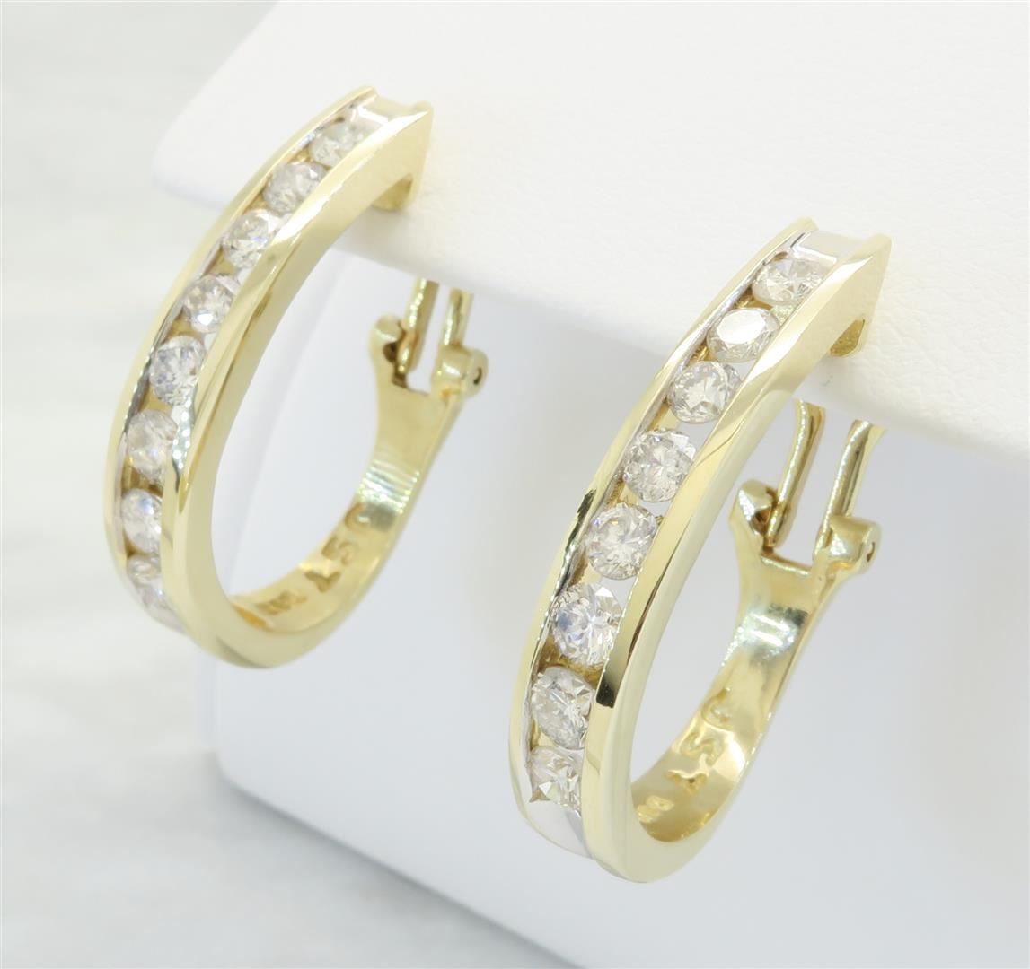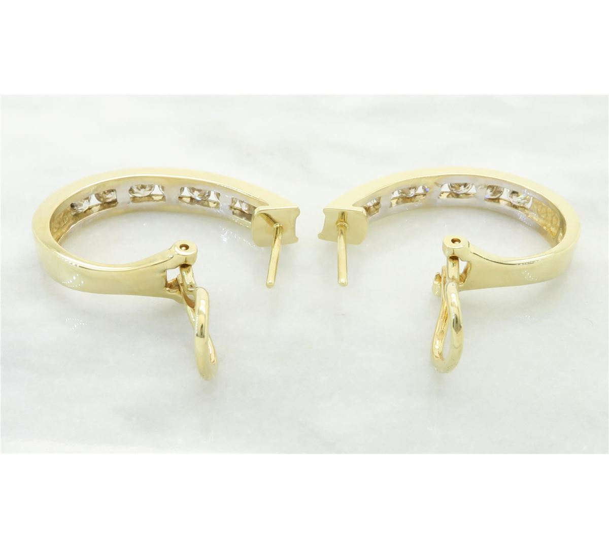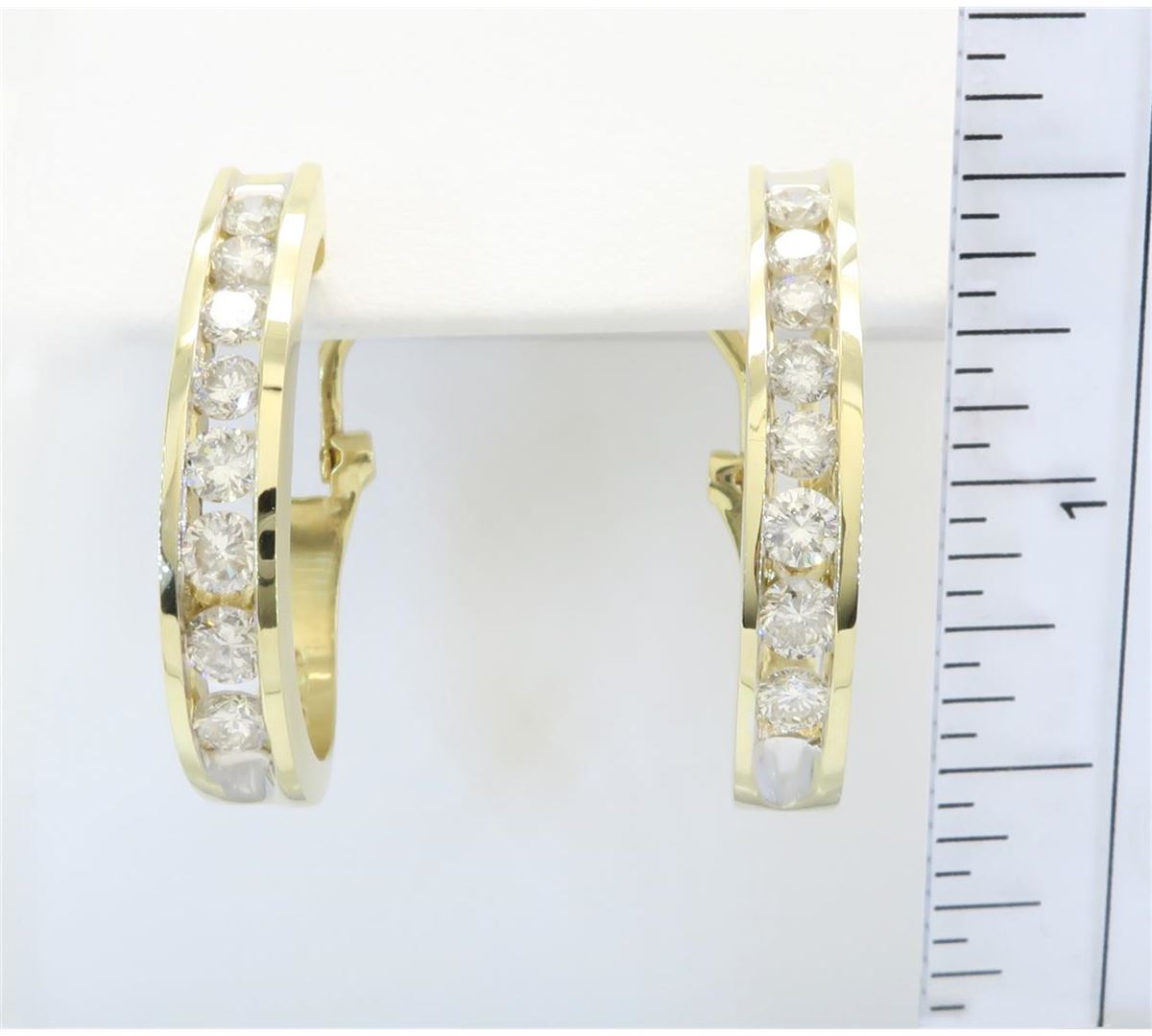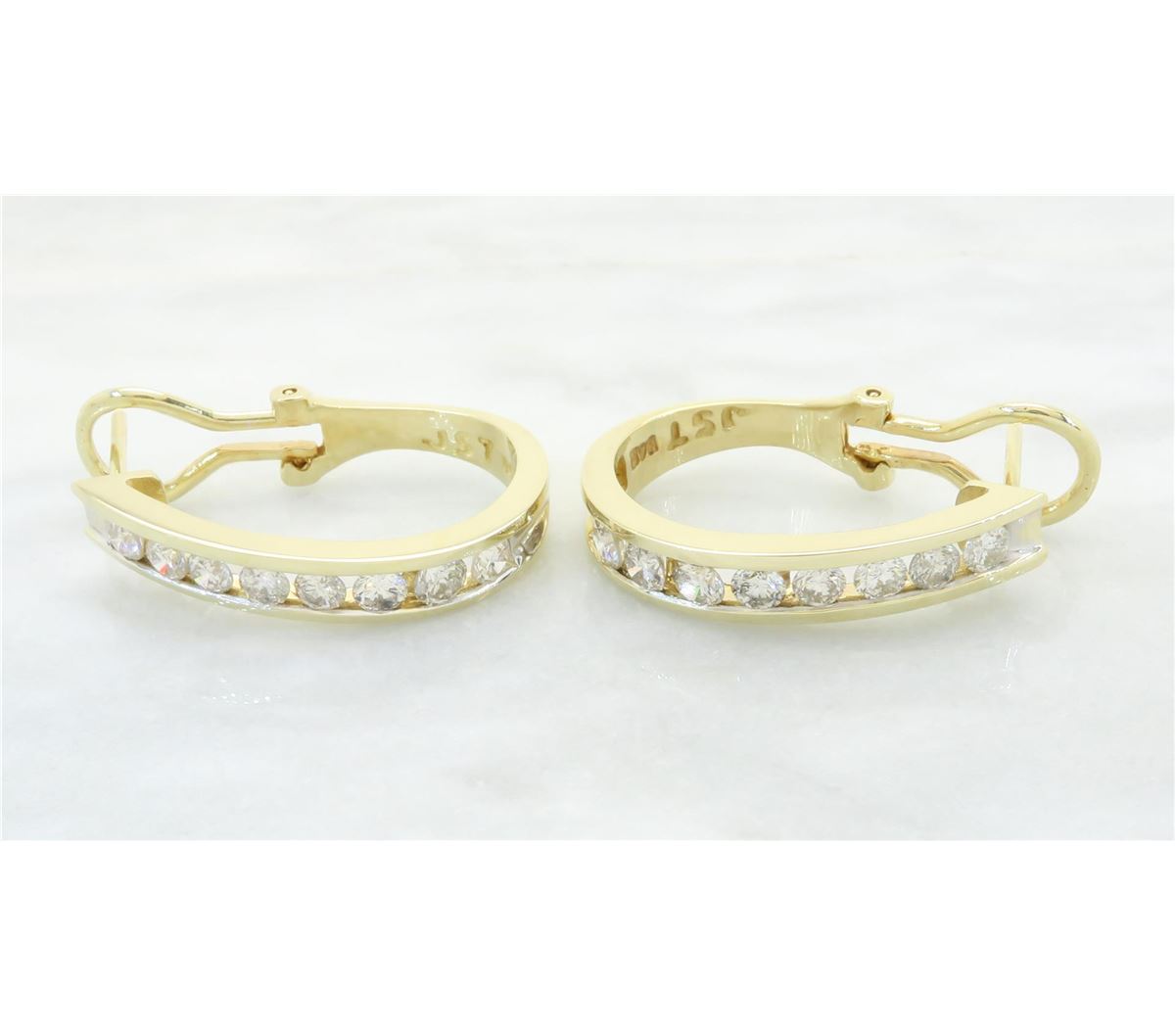 One pair of tested 14K Yellow Gold earrings. Containing: 16 Round Brilliant Cut Diamonds. Clarity: I-SI and Color: H-J. Approximate total diamond weight: 1.40CTW. All diamonds are graded in the mounting unless otherwise stated. Weight of earrings: 7.6 grams.
