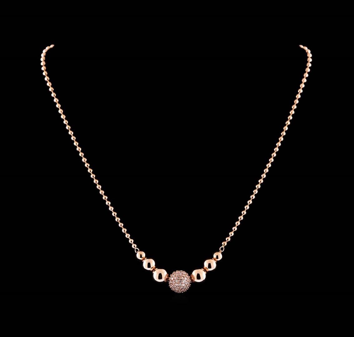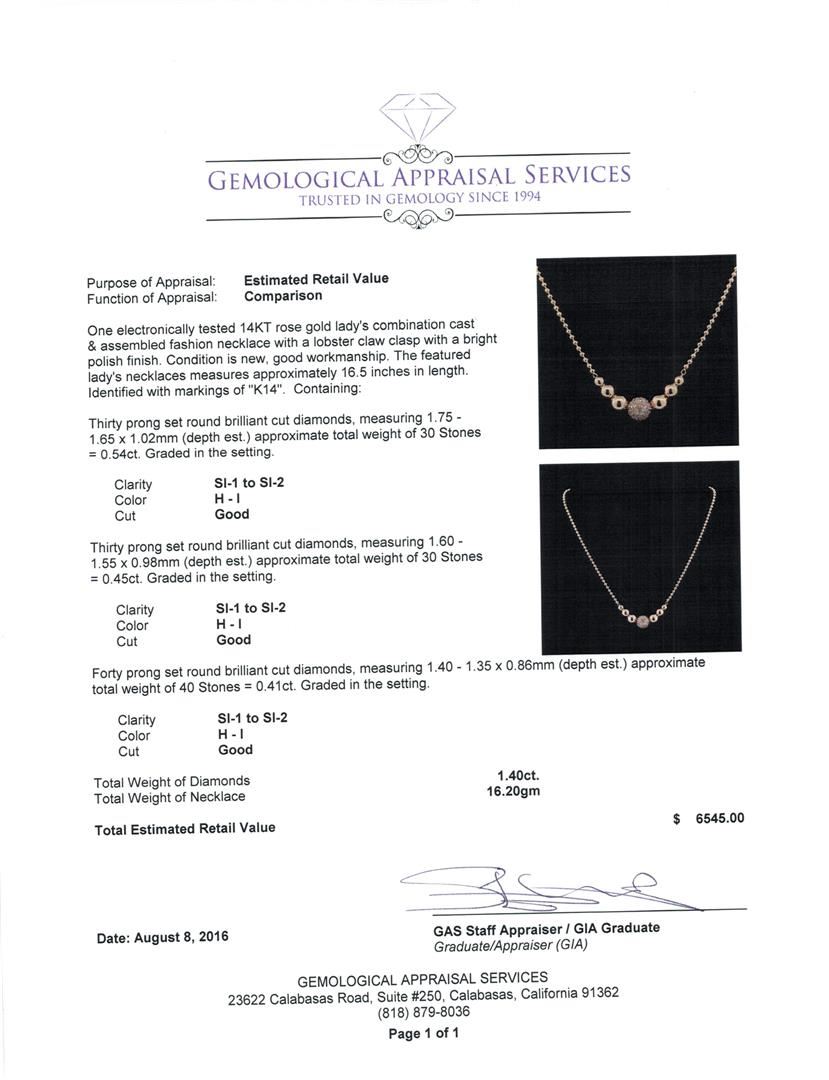 One electronically tested 14KT rose gold lady's combination cast & assembled fashion necklace with a lobster claw clasp with a bright polish finish. The featured lady's necklaces measures approximately 16.5 inches in length. Identified with markings of 'K14'. Condition is new, good workmanship. Containing: Thirty prong set round brilliant cut diamonds, measuring 1.75 - 1.65 x 1.02mm (depth est.) approximate total weight of 30 Stones = 0.54ct. Graded in the setting. Clarity SI-1 to SI-2. Color: H - I Cut Good Thirty prong set round brilliant cut diamonds, measuring 1.60 - 1.55 x 0.98mm (depth est.) approximate total weight of 30 Stones = 0.45ct. Graded in the setting. Clarity SI-1 to SI-2. Color: H - I Cut Good Forty prong set round brilliant cut diamonds, measuring 1.40 - 1.35 x 0.86mm (depth est.) approximate total weight of 40 Stones = 0.41ct. Graded in the setting. Clarity SI-1 to SI-2. Color: H - I Cut Good. Total Weight of Diamonds 1.40ct.. Total Weight of Necklace 16.20gm. GAS Appraised at $6,545.00.