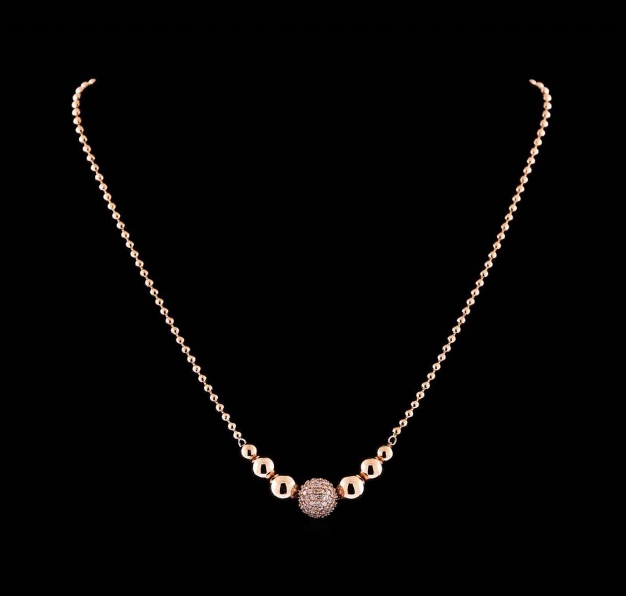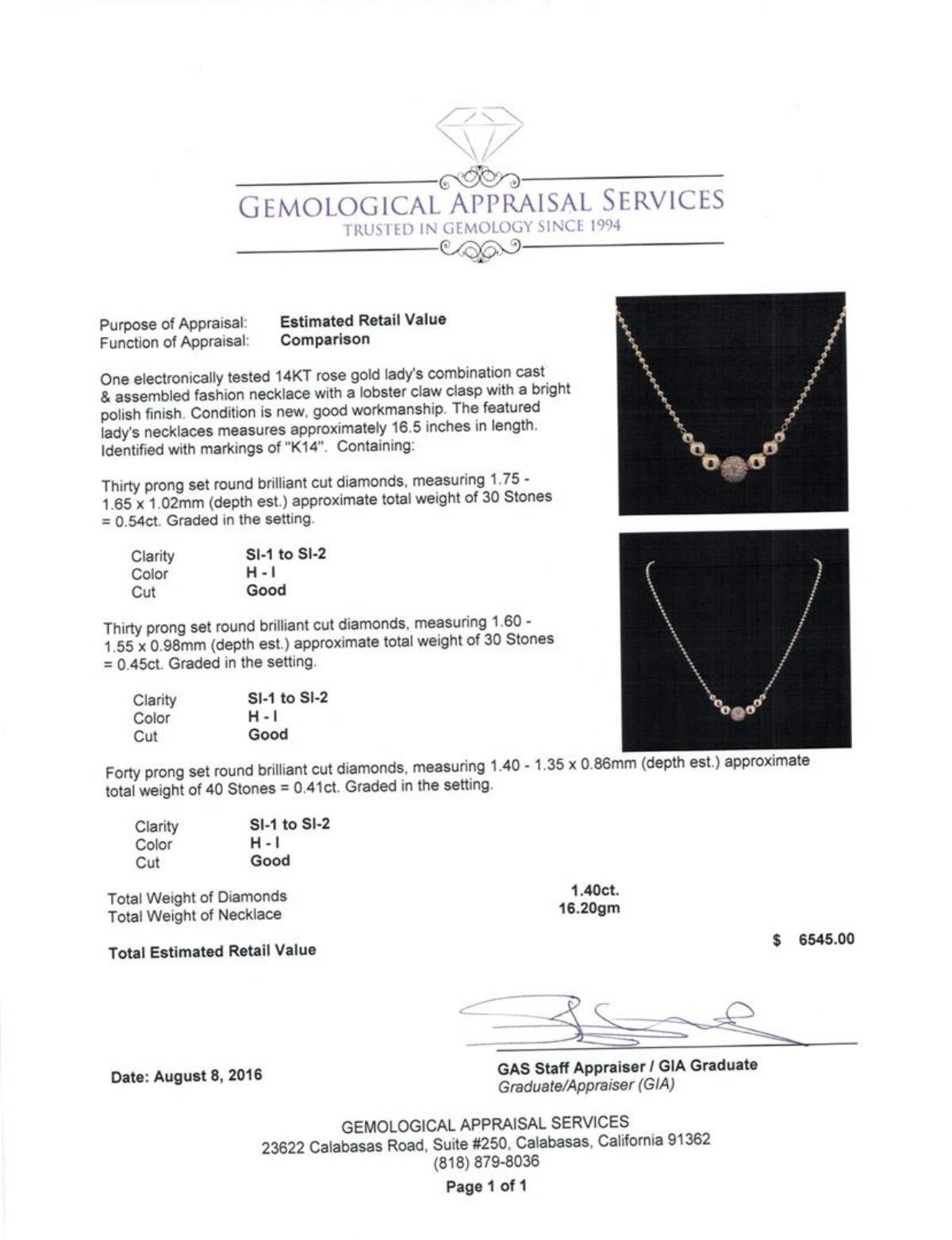 One electronically tested 14KT rose gold lady's combination cast & assembled fashion necklace with a lobster claw clasp with a bright polish finish. The featured lady's necklaces measures approximately 16.5 inches in length. Identified with markings of 'K14'. Condition is new, good workmanship. Containing: Thirty prong set round brilliant cut diamonds, measuring 1.75 - 1.65 x 1.02mm (depth est.) approximate total weight of 30 Stones = 0.54ct. Graded in the setting. Clarity SI-1 to SI-2. Color: H - I Cut Good Thirty prong set round brilliant cut diamonds, measuring 1.60 - 1.55 x 0.98mm (depth est.) approximate total weight of 30 Stones = 0.45ct. Graded in the setting. Clarity SI-1 to SI-2. Color: H - I Cut Good Forty prong set round brilliant cut diamonds, measuring 1.40 - 1.35 x 0.86mm (depth est.) approximate total weight of 40 Stones = 0.41ct. Graded in the setting. Clarity SI-1 to SI-2. Color: H - I Cut Good. Total Weight of Diamonds 1.40ct.. Total Weight of Necklace 16.20gm. GAS Appraised.