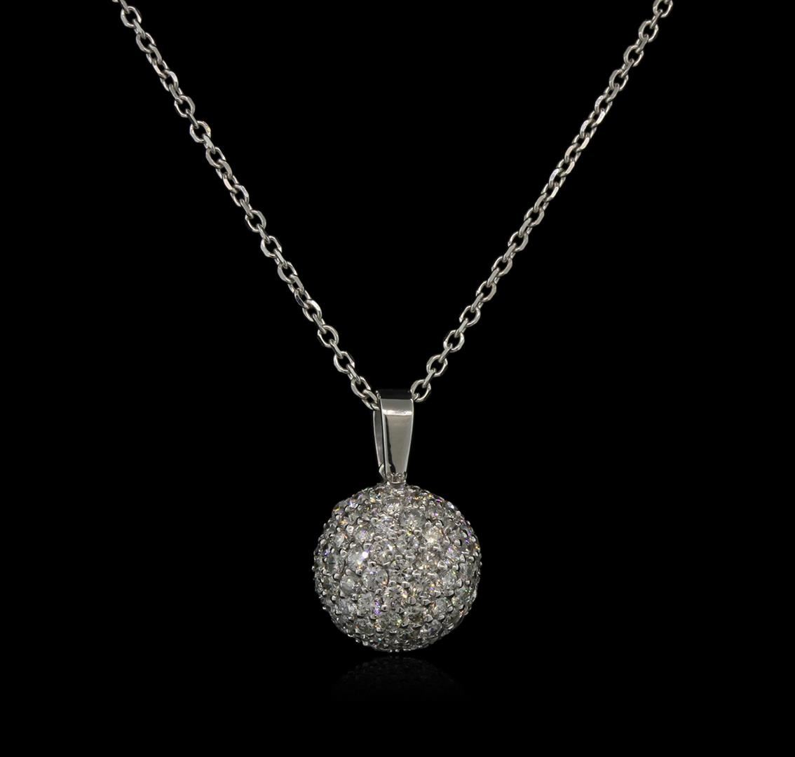 One electronically tested 14KT white gold lady's combination cast & assembled ball pendant & chain 18.0" long, 1.4mm diamond cut cable link with a lobster claw clasp with a bright polish finish. Identified with markings of "14K". Condition is new, good workmanship. Containing: Sixty-Eight prong set round brilliant cut diamonds, measuring 1.80 - 1.70 x 1.12mm (depth est.) approximate. Total Weight of 68 Stones = 1.40ct. Graded in the setting. Clarity: SI-1 to I-1. Color: H - Good. Total Weight of Diamonds 1.40ct. Total Weight of Pendant & Chain 5.70gm. GAS Appraised at $4,185.00.