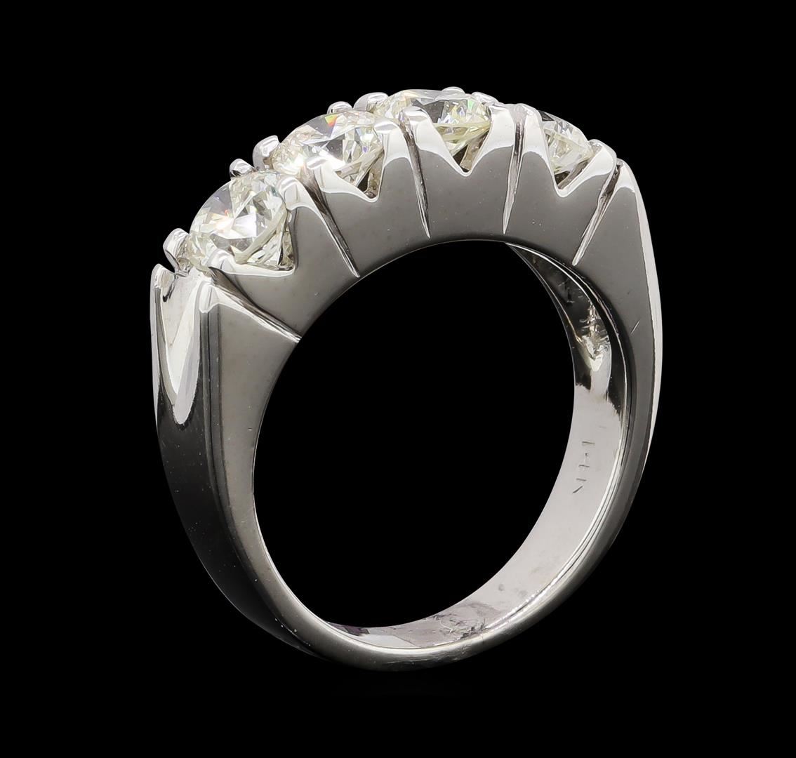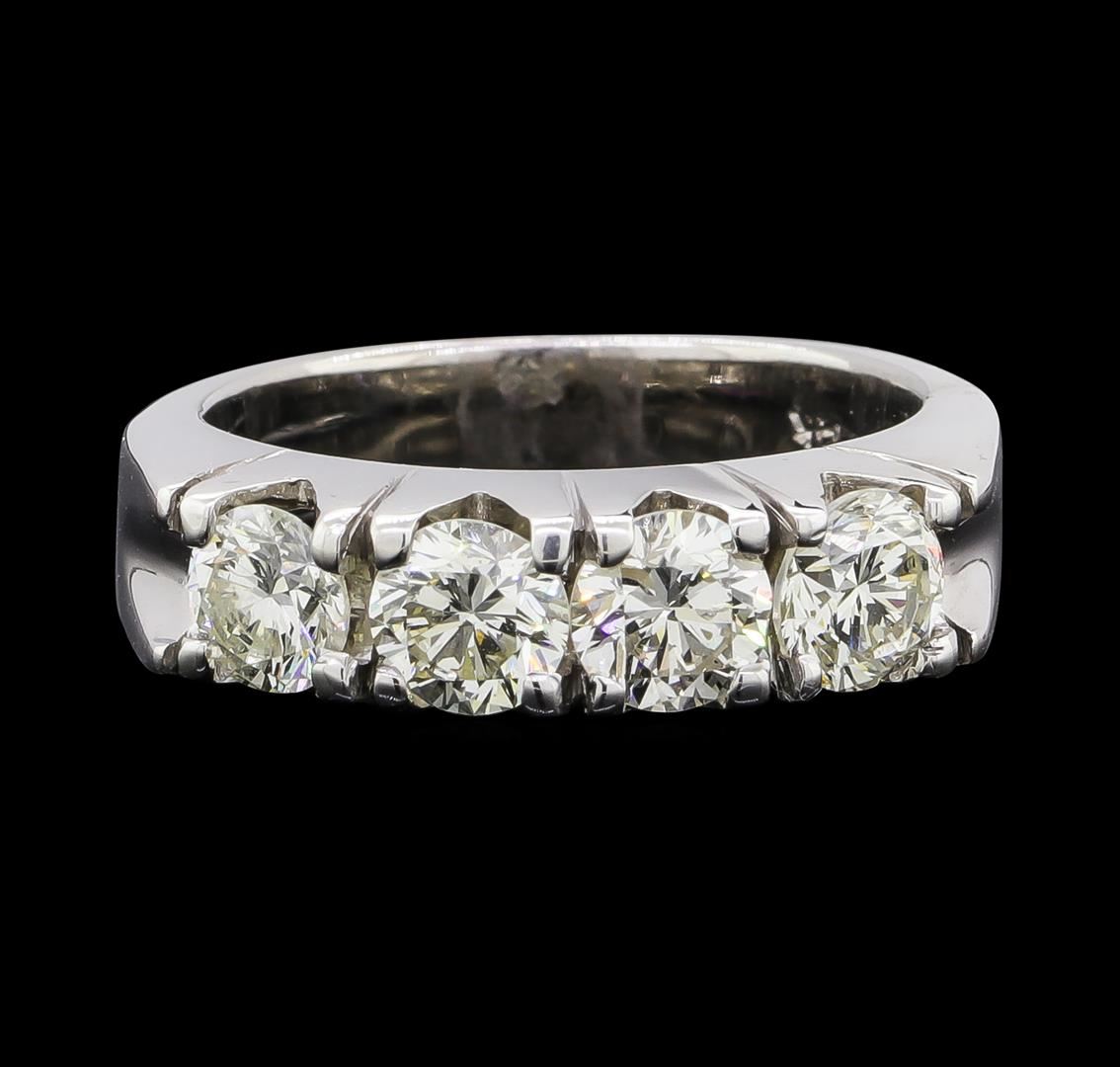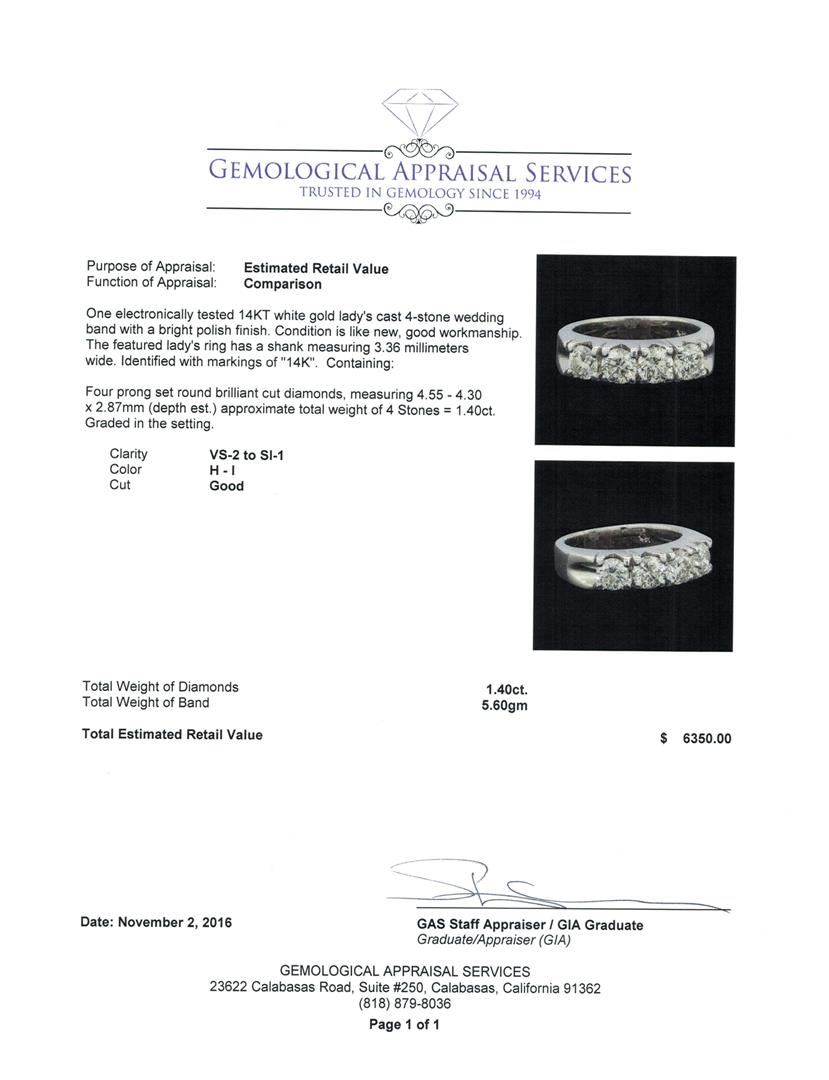 One electronically tested 14KT white gold lady's cast 4-stone wedding band with a bright polish finish. The featured lady's ring has a shank measuring 3.36 millimeters wide. Identified with markings of '14K'. Condition is like new, good workmanship. Containing: Four prong set round brilliant cut diamonds, measuring 4.55 - 4.30 x 2.87mm (depth est.) approximate total weight of 4 Stones = 1.40ct. Graded in the setting. Clarity VS-2 to SI-1. Color: H - I Cut Good. Total Weight of Diamonds 1.40ct.. Total Weight of Band 5.60gm. GAS Appraised at $6,350.00.