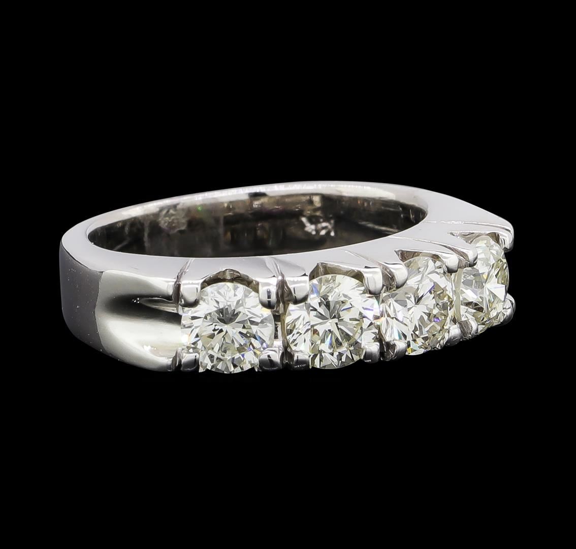 One electronically tested 14KT white gold lady's cast 4-stone wedding band with a bright polish finish. The featured lady's ring has a shank measuring 3.36 millimeters wide. Identified with markings of '14K'. Condition is like new, good workmanship. Containing: Four prong set round brilliant cut diamonds, measuring 4.55 - 4.30 x 2.87mm (depth est.) approximate total weight of 4 Stones = 1.40ct. Graded in the setting. Clarity VS-2 to SI-1. Color: H - I Cut Good. Total Weight of Diamonds 1.40ct.. Total Weight of Band 5.60gm. GAS Appraised at $6,350.00.