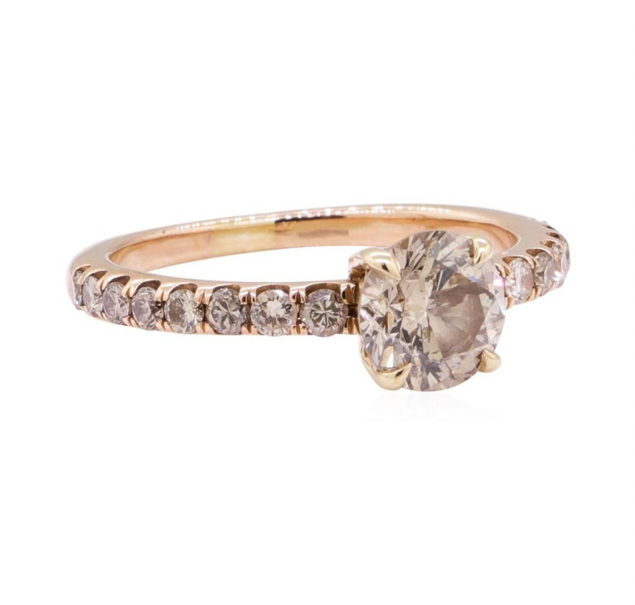 One electronically tested 18KT rose gold lady's cast wedding ring with a straight line motif with a bright polish finish. The featured lady's ring has a shank measuring 1.62 millimeters wide. Identified with markings of '18K'. Condition is like new, good workmanship. Containing: One prong set round brilliant cut diamond, measuring 6.55 - 6.52 x 4.04mm (depth est.) approximate weight of 1.05ct. Colored gemstones are presumed to have been subjected to commonly used enhancement processes. Graded in the setting. Color Fancy Light Orangy Pinkish Brown Clarity I-1 Cut Good Sixteen prong set round brilliant cut diamonds, measuring 1.80 - 1.70 x 1.09mm (depth est.) approximate total weight of 16 Stones = 0.35ct. Colored gemstones are presumed to have been subjected to commonly used enhancement processes. Graded in the setting. Color Fancy Light Orangy Pinkish Brown Clarity SI-1 to I-1 Cut Good. Total Weight of Diamonds 1.40ct.. Total Weight of Ring 2.60gm GAS Appraised at $7285.00. GAS Appraised.