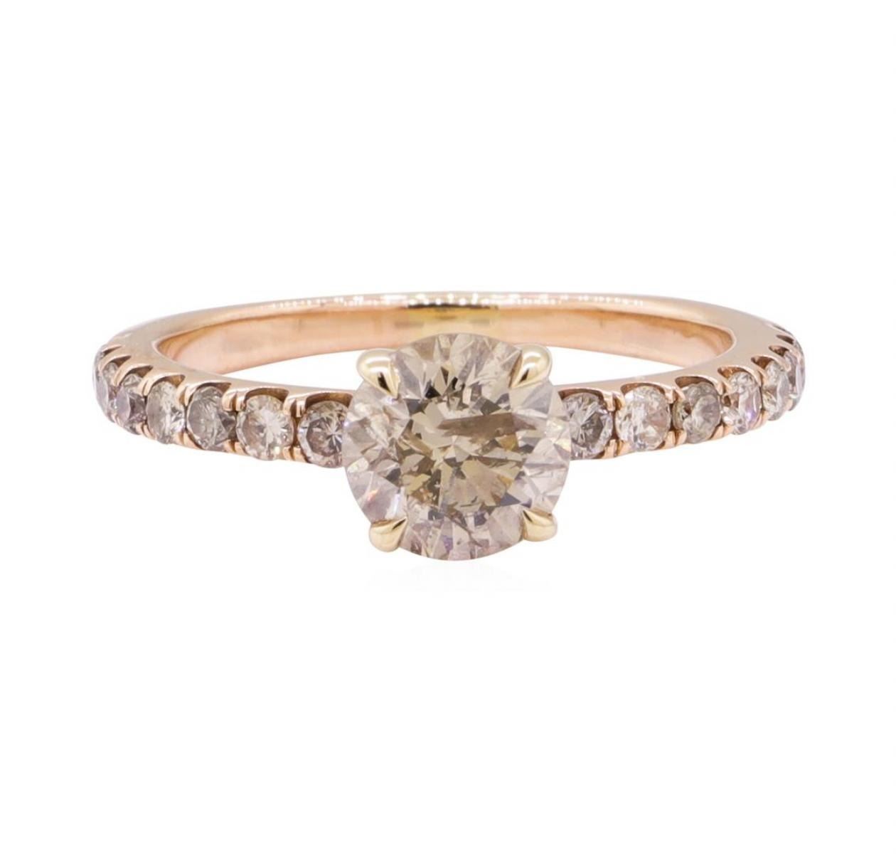 One electronically tested 18KT rose gold lady's cast wedding ring with a straight line motif with a bright polish finish. The featured lady's ring has a shank measuring 1.62 millimeters wide. Identified with markings of '18K'. Condition is like new, good workmanship. Containing: One prong set round brilliant cut diamond, measuring 6.55 - 6.52 x 4.04mm (depth est.) approximate weight of 1.05ct. Colored gemstones are presumed to have been subjected to commonly used enhancement processes. Graded in the setting. Color Fancy Light Orangy Pinkish Brown Clarity I-1 Cut Good Sixteen prong set round brilliant cut diamonds, measuring 1.80 - 1.70 x 1.09mm (depth est.) approximate total weight of 16 Stones = 0.35ct. Colored gemstones are presumed to have been subjected to commonly used enhancement processes. Graded in the setting. Color Fancy Light Orangy Pinkish Brown Clarity SI-1 to I-1 Cut Good. Total Weight of Diamonds 1.40ct.. Total Weight of Ring 2.60gm GAS Appraised at $7285.00. GAS Appraised.