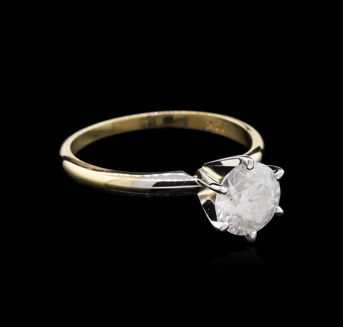 One electronically tested 14KT yellow gold ladies cast diamond solitaire ring. The featured diamond is set within a white gold basket, completed by a one and one-half millimeter wide band. Bright polish finish. Identified with markings of "14K". Condition is new, good workmanship. Containing: One prong set round brilliant cut diamond, measuring 6.80 - 6.79 x 4.40mm (depth est.), 6.00.%. GTCF approximate weight of 1.40ct with a medium strong blue fluorescence. Graded in the setting. Clarity: I-2. Color: J. Depth 64.7%. Table 55.9%. Total Weight of Diamonds 1.40ct. AIG Appraised at $7,945.00.