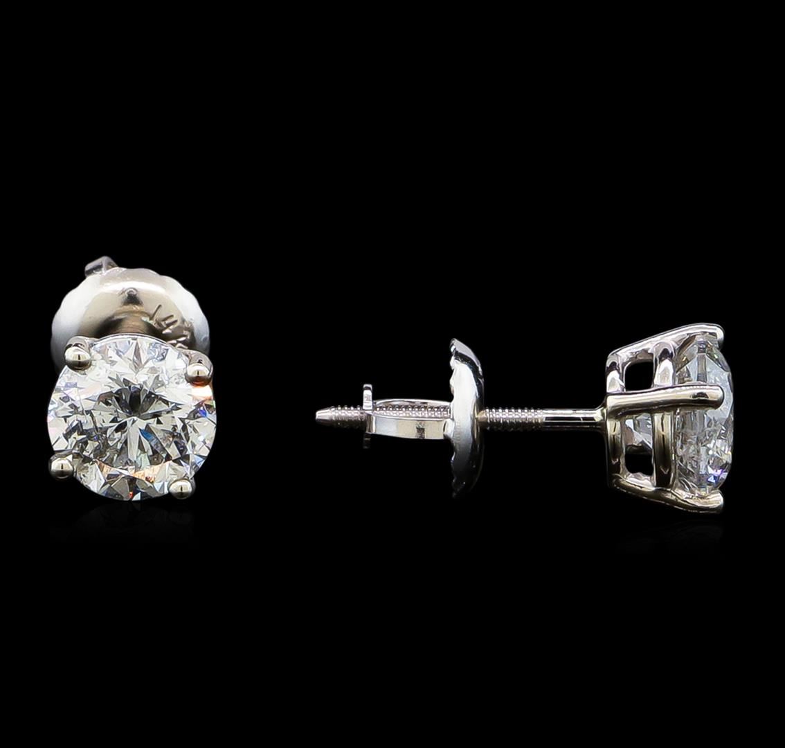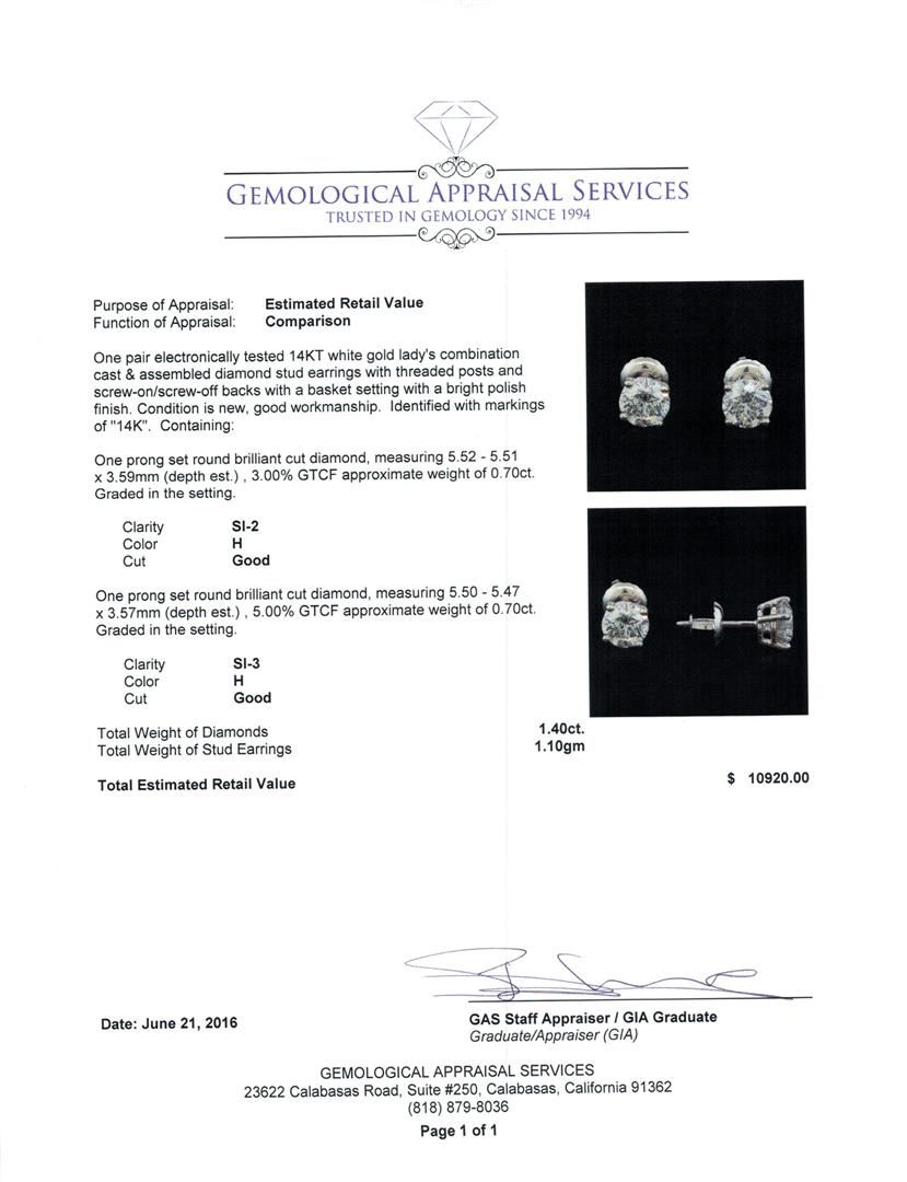 One pair electronically tested 14KT white gold lady's combination cast & assembled diamond stud earrings with threaded posts and screw-on/screw-off backs with a basket setting with a bright polish finish. Identified with markings of "14K". Condition is new, good workmanship. Containing: One prong set round brilliant cut diamond, measuring 5.52 - 5.51 x 3.59mm (depth est.) , 3.00.%. GTCF approximate weight of 0.70ct. Graded in the setting. Clarity: SI-2. Color: Good One prong set round brilliant cut diamond, measuring 5.50 - 5.47 x 3.57mm (depth est.) , 5.00.%. GTCF approximate weight of 0.70ct. Graded in the setting. Clarity: SI-3. Color: Good. Total Weight of Diamonds 1.40ct. Total Weight of Stud Earrings 1.10gm. GAS Appraised at $10,920.00.
