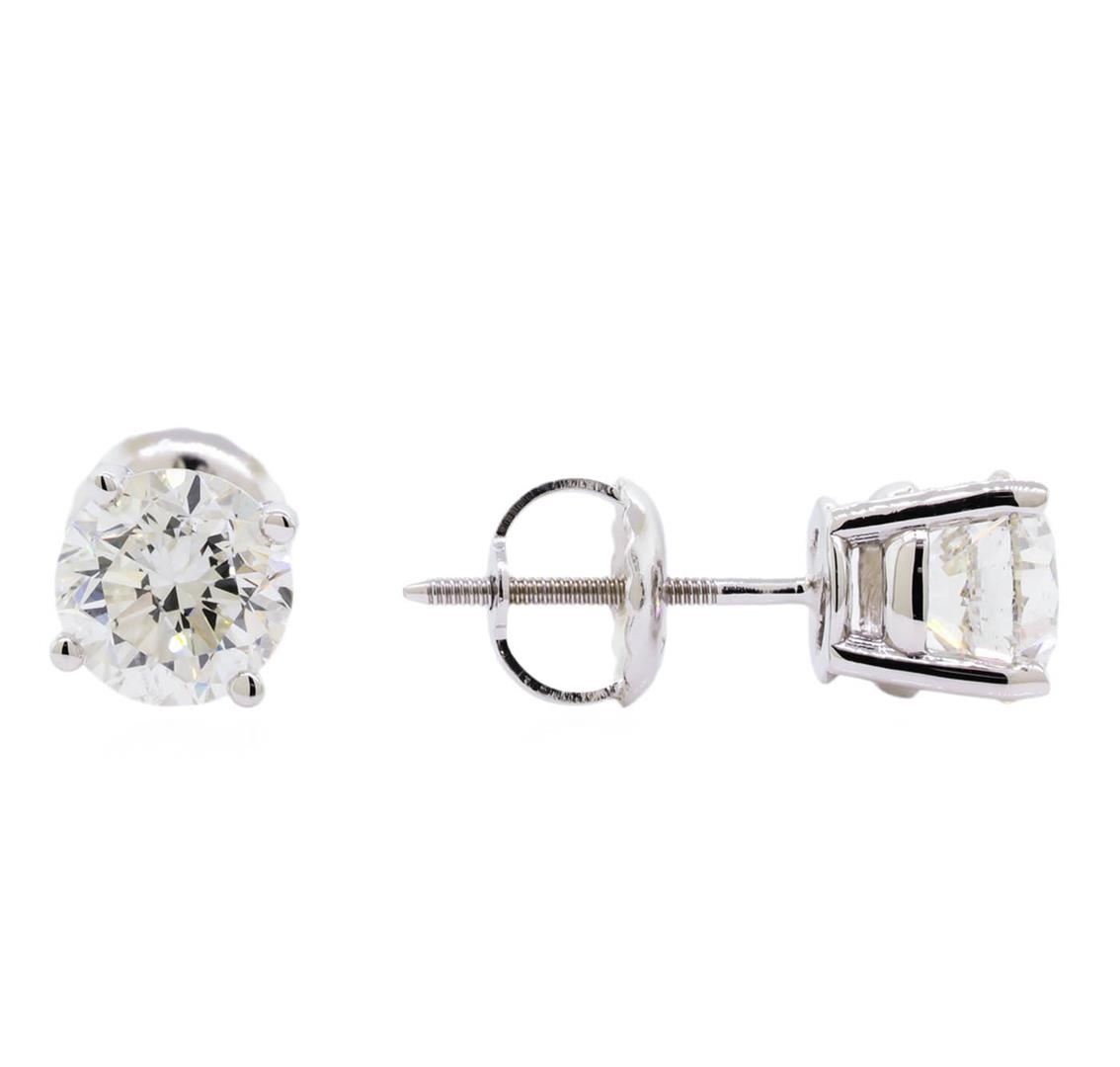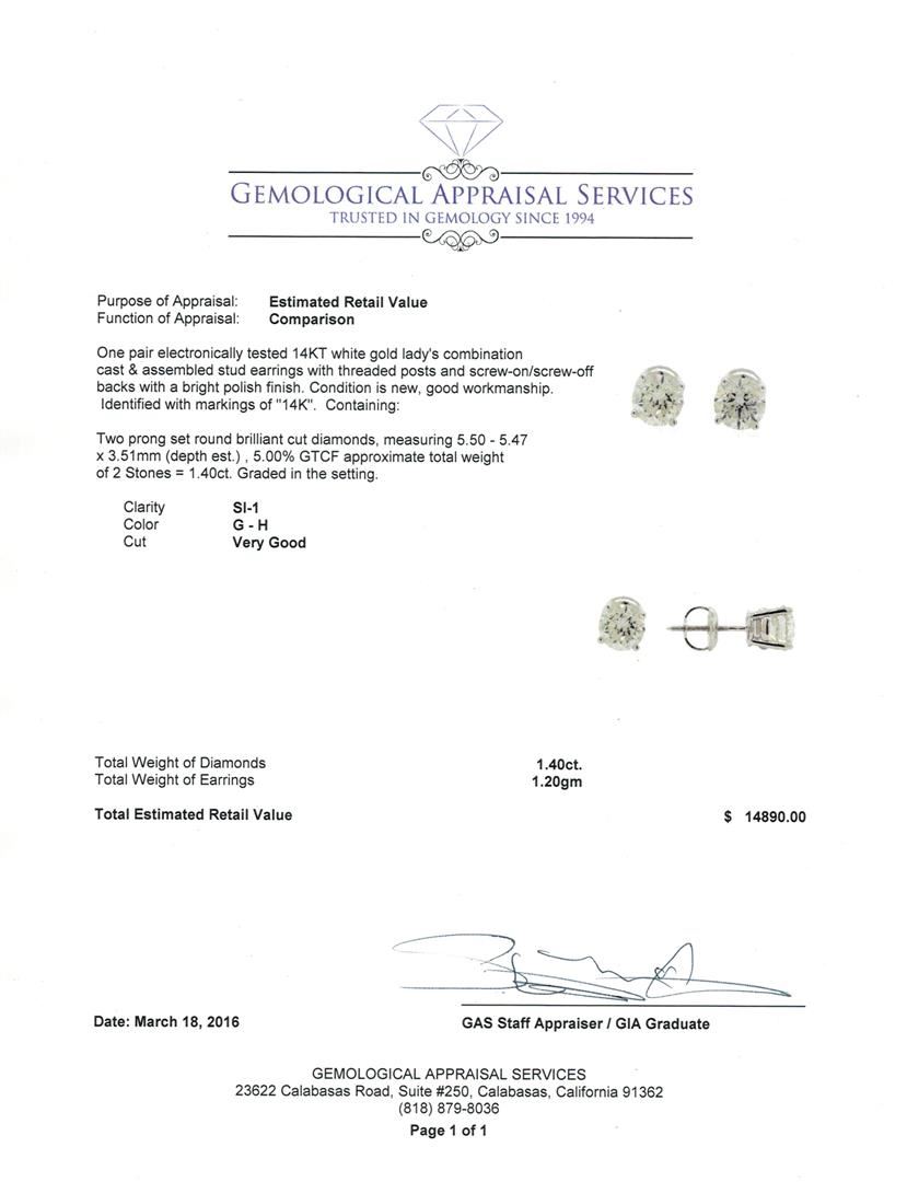One pair electronically tested 14KT white gold lady's combination cast & assembled stud earrings with threaded posts and screw-on/screw-off backs with a bright polish finish. Identified with markings of "14K". Condition is new, good workmanship. Containing: Two prong set round brilliant cut diamonds, measuring 5.50 - 5.47 x 3.51mm (depth est.) , 5.00.%. GTCF approximate total weight of 2 Stones = 1.40ct. Graded in the setting. Clarity: SI-1. Color: G - Very Good. Total Weight of Diamonds 1.40ct. Total Weight of Earrings 1.20gm. GAS Appraised at $14,890.00.