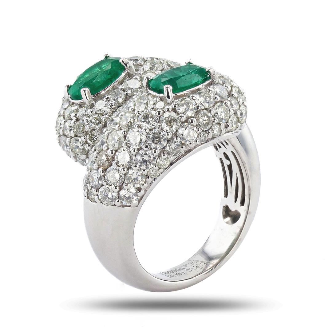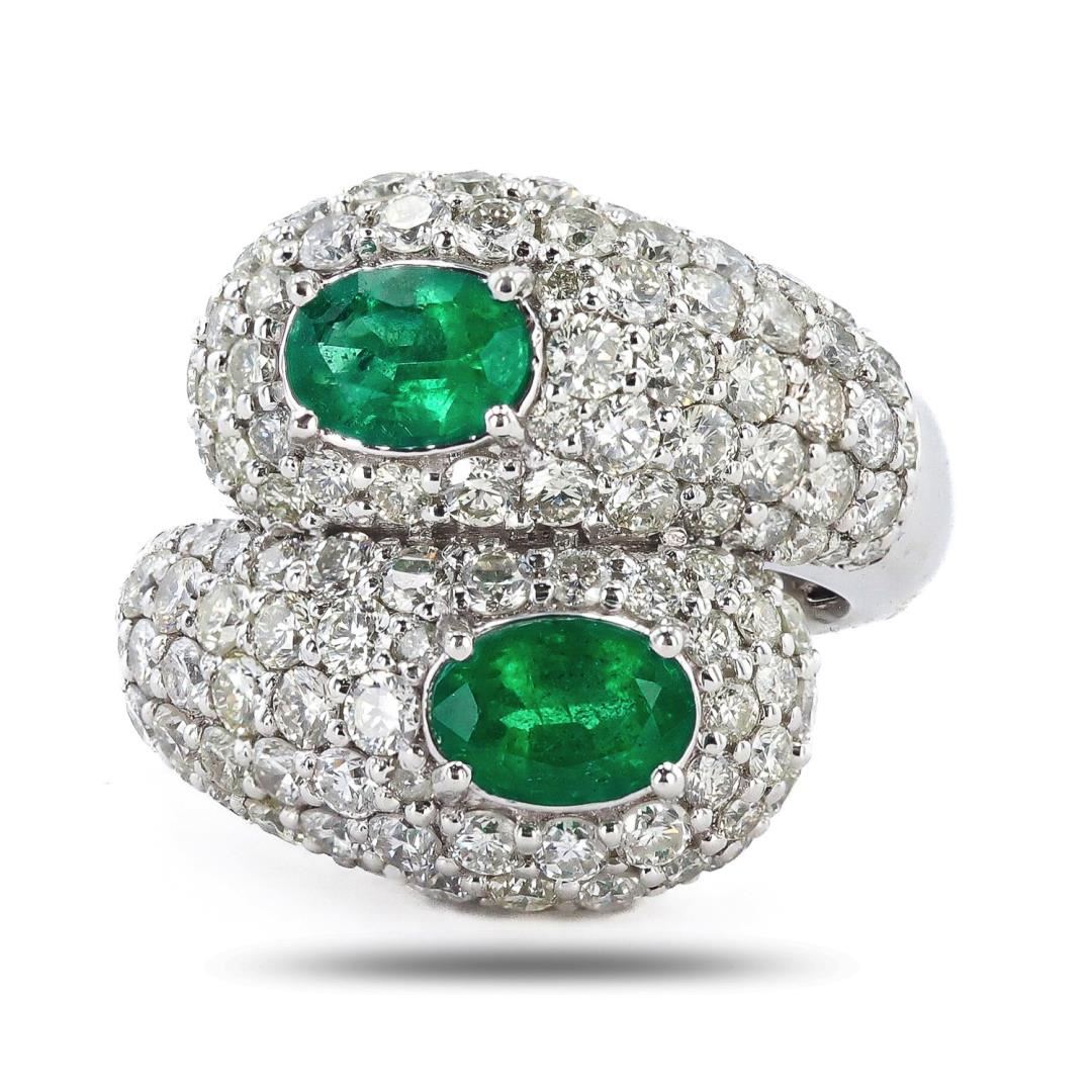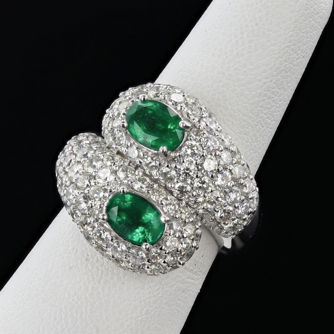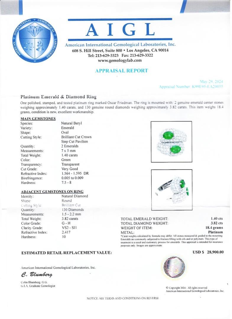 One polished. stamped. and tested platinum ring marked Oscar Friedman. The ring is mounted with: 2 genuine emerald center stones weighing approximately 1.40 carats, and 130 genuine round diamonds weighing approximately 3.82 carats. This item weighs 18.4 grams, condition is new, excellent workmanship. #MAIN GEMSTONES# Species: Natural Beryl Variety: Emerald Shape: Oval Cutting Style: Brilliant Cut Crown, Step Cut Pavilion Quantity: 2 Emeralds Measurements: 7 x 5mm Total Weight: 1.40 carats Color: Green Transparency: Transparent Cut Grade: Very Good Refractive Index: 1.564 - 1.595 DR Birefringence: 0.005 to 0.009 Hardness: 7.5 - 8 #ADJACENT GEMSTONES ON RING# Identity: Natural Diamond Shape: Round Cutting Style: Brilliant Cut Quantity: 130 Diamonds Measurements: 1.5 - 2.2mm Total Weight: 3.82 carats Color Grade: G-H Clarity Grade: VS2-SI1 Refractive Index: 2.417 Hardness: 10 TOTAL EMERALD WEIGHT: 1.40 cts TOTAL DIAMOND WEIGHT: 3.82 cts WEIGHT OF ITEM: 18.4 grams METAL: Platinum #LREF-9995