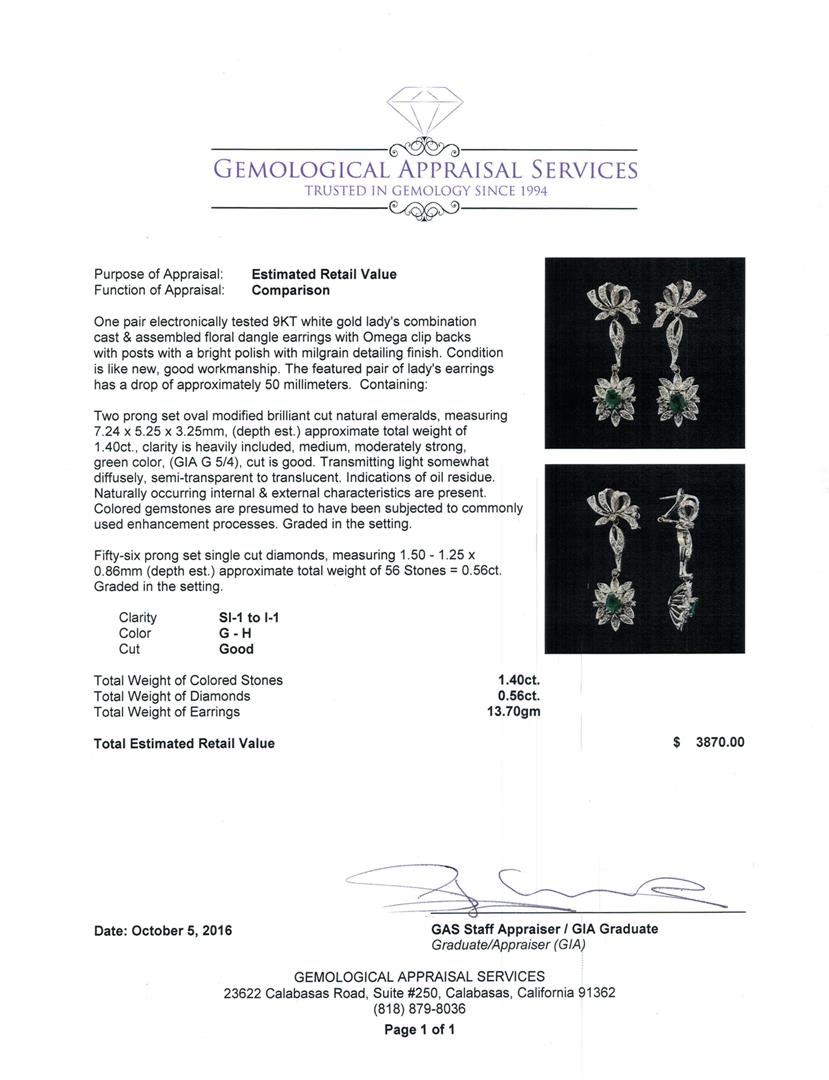 One pair electronically tested 9KT white gold lady's combination cast & assembled floral dangle earrings with Omega clip backs with posts with a bright polish with milgrain detailing finish. The featured pair of lady's earrings has a drop of approximately 50 millimeters. Condition is like new, good workmanship. Containing: Two prong set oval modified brilliant cut natural emeralds, measuring 7.24 x 5.25 x 3.25mm, (depth est.) approximate total weight of 1.40ct., clarity is heavily included, medium, moderately strong, green color, (GIA G 5/4), cut is good. Transmitting light somewhat diffusely, semi-transparent to translucent. Indications of oil residue. Naturally occurring internal & external characteristics are present. Colored gemstones are presumed to have been subjected to commonly used enhancement processes. Graded in the setting. Fifty-Six prong set single cut diamonds, measuring 1.50 - 1.25 x 0.86mm (depth est.) approximate total weight of 56 Stones = 0.56ct. Graded in the setting. Clarity SI-1 to I-1. Color: G - H Cut Good. Total Weight of Colored Stones 1.40ct.. Total Weight of Diamonds 0.56ct.. Total Weight of Earrings 13.70gm. GAS Appraised at $3,870.00.