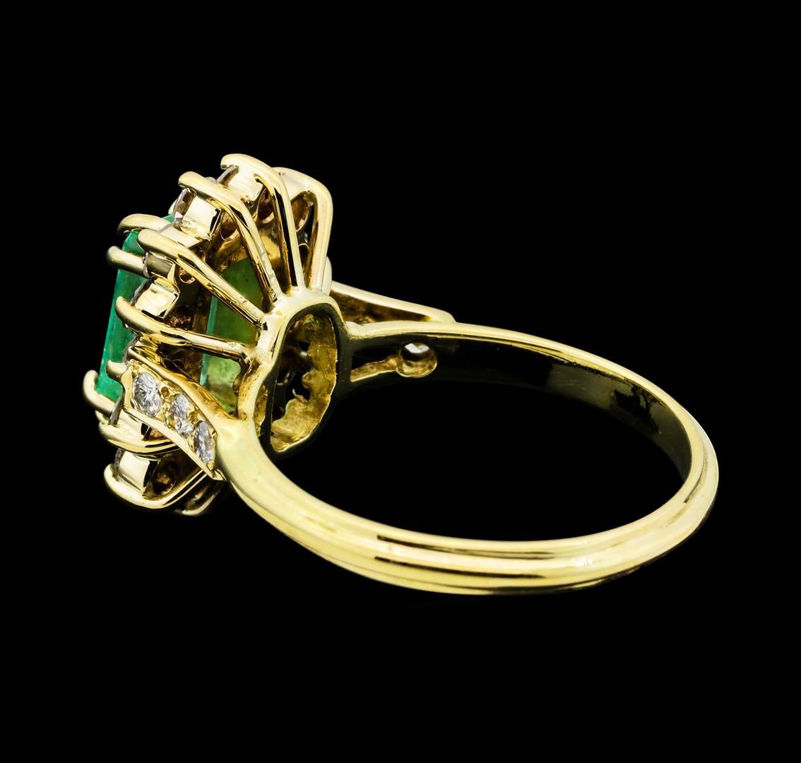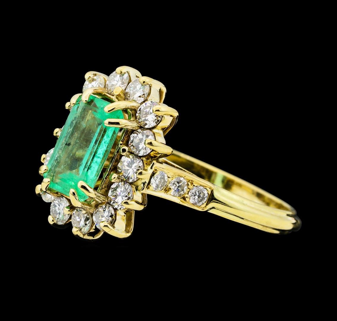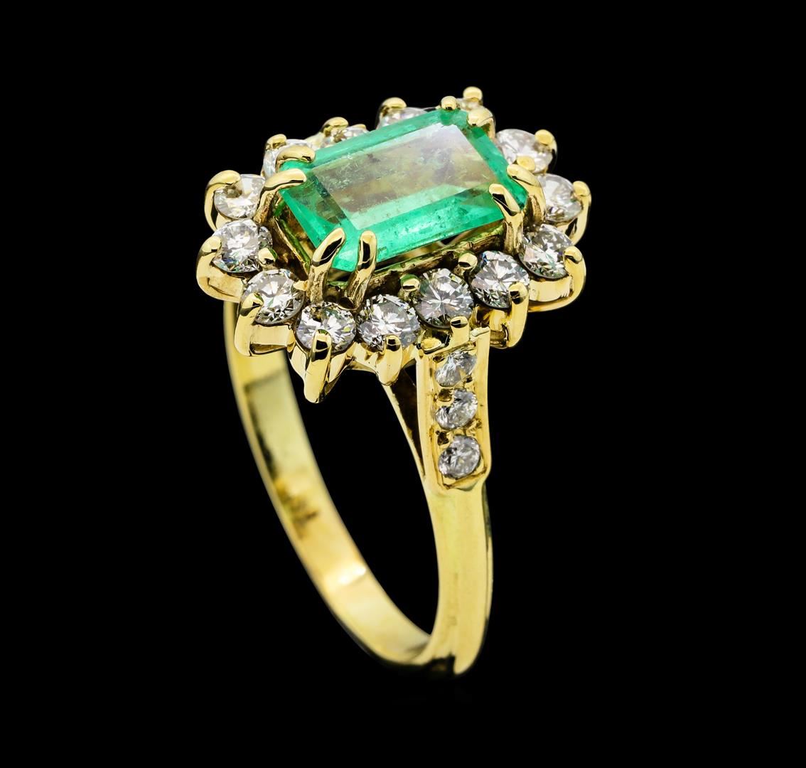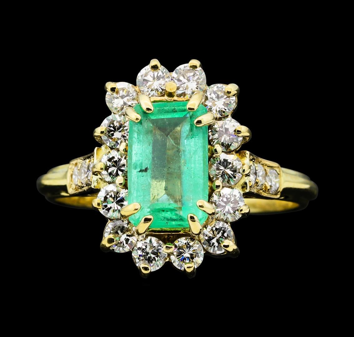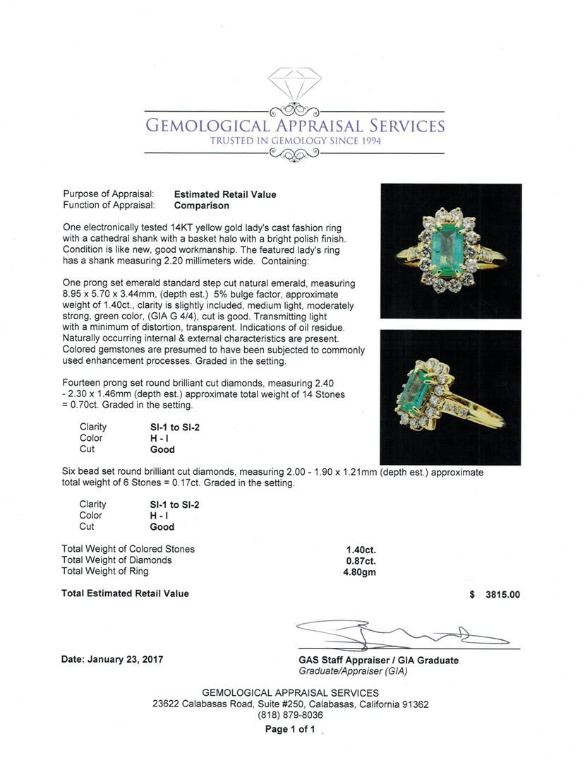 One electronically tested 14KT yellow gold lady's cast fashion ring with a cathedral shank with a basket halo with a bright polish finish. The featured lady's ring has a shank measuring 2.20 millimeters wide. Condition is like new, good workmanship. Containing: One prong set emerald standard step cut natural emerald, measuring 8.95 x 5.70 x 3.44mm, (depth est.) 5%. bulge factor, approximate weight of 1.40ct., clarity is slightly included, medium light, moderately strong, green color, (GIA G 4/4), cut is good. Transmitting light with a minimum of distortion, transparent. Indications of oil residue. Naturally occurring internal & external characteristics are present. Colored gemstones are presumed to have been subjected to commonly used enhancement processes. Graded in the setting. Fourteen prong set round brilliant cut diamonds, measuring 2.40 - 2.30 x 1.46mm (depth est.) approximate total weight of 14 Stones = 0.70ct. Graded in the setting. Clarity SI-1 to SI-2. Color: H - I Cut Good Six bead set round brilliant cut diamonds, measuring 2.00 - 1.90 x 1.21mm (depth est.) approximate total weight of 6 Stones = 0.17ct. Graded in the setting. Clarity SI-1 to SI-2. Color: H - I Cut Good. Total Weight of Colored Stones 1.40ct.. Total Weight of Diamonds 0.87ct.. Total Weight of Ring 4.80gm GAS Appraised at $3,815.00.