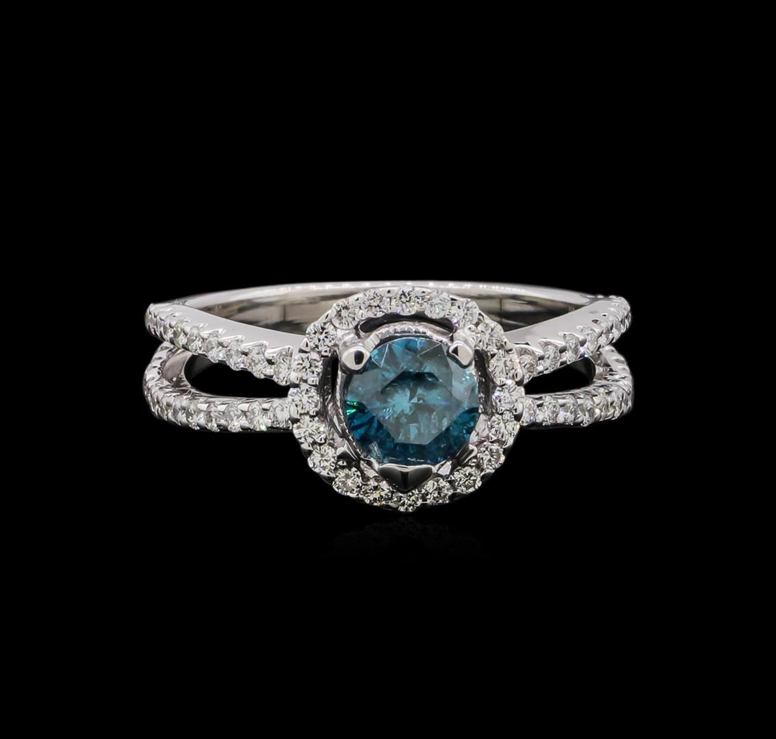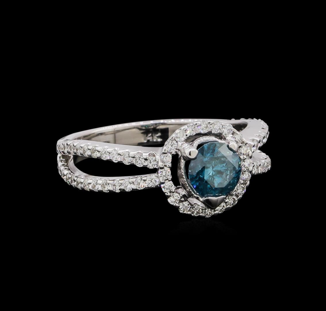 One electronically tested 14KT white gold ladies cast diamond ring. The featured diamond is set within a diamond bezel supported by diamond set split shoulders, completed by a three millimeter wide band. Bright polish finish with milgrain detailing. Identified with markings of '14K'. Condition is new, good workmanship. Containing: One prong set round brilliant cut diamond, measuring 5.70 - 5.70 x 3.60mm (depth est.), 2.00.%. GTCF approximate weight of 0.73ct. Graded in the setting. Clarity I-2. Depth: 63.2%. Table: 59.7%. Seventy-Two prong set round brilliant cut diamonds, measuring 1.40 - 1.30 x 0.81mm (depth est.) approximate total weight of 72 Stones = 0.67ct. Graded in the setting. Clarity VS-2 to SI-1. Color: F - H. Total Weight of Diamonds 1.40ct.. Total Weight of Ring 4.89gm. AIG Appraised at $5,980.00.