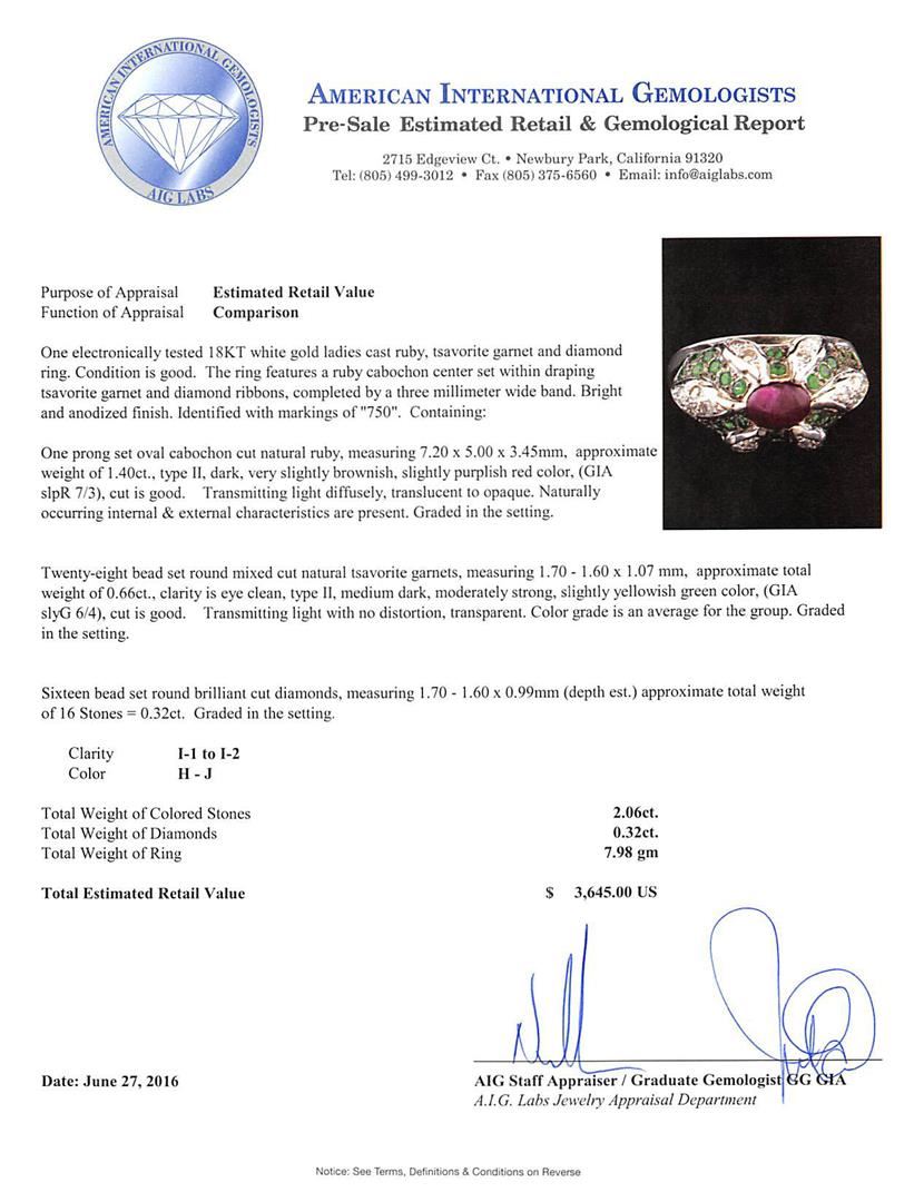One electronically tested 18KT white gold ladies cast ruby, tsavorite garnet and diamond ring. The ring features a ruby cabochon center set within draping tsavorite garnet and diamond ribbons, completed by a three millimeter wide band. Bright and anodized finish. Identified with markings of "750". Condition is good. Containing: One prong set oval cabochon cut natural ruby, measuring 7.20 x 5.00 x 3.45mm, approximate weight of 1.40ct., type II, dark, very slightly brownish, slightly purplish red color, (GIA slpR 7/3), cut is good. Transmitting light diffusely, translucent to opaque. Naturally occurring internal & external characteristics are present. Graded in the setting. Twenty-eight bead set round mixed cut natural tsavorite garnets, measuring 1.70 - 1.60 x 1.07 mm, approximate total weight of 0.66ct., clarity is eye clean, type II, medium dark, moderately strong, slightly yellowish green color, (GIA slyG 6/4), cut is good. Transmitting light with no distortion, transparent. Color grade is an average for the group. Graded in the setting. Sixteen bead set round brilliant cut diamonds, measuring 1.70 - 1.60 x 0.99mm (depth est.) approximate total weight of 16 Stones = 0.32ct. Graded in the setting. Clarity: I-1 to I-2. Color: H - J. Total Weight of Colored Stones 2.06ct. Total Weight of Diamonds 0.32ct. Total Weight of Ring 7.98gm. AIG Appraised at $3,645.00.
