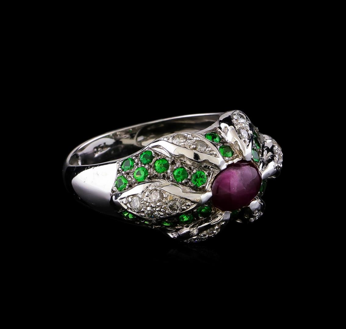 One electronically tested 18KT white gold ladies cast ruby, tsavorite garnet and diamond ring. The ring features a ruby cabochon center set within draping tsavorite garnet and diamond ribbons, completed by a three millimeter wide band. Bright and anodized finish. Identified with markings of "750". Condition is good. Containing: One prong set oval cabochon cut natural ruby, measuring 7.20 x 5.00 x 3.45mm, approximate weight of 1.40ct., type II, dark, very slightly brownish, slightly purplish red color, (GIA slpR 7/3), cut is good. Transmitting light diffusely, translucent to opaque. Naturally occurring internal & external characteristics are present. Graded in the setting. Twenty-eight bead set round mixed cut natural tsavorite garnets, measuring 1.70 - 1.60 x 1.07 mm, approximate total weight of 0.66ct., clarity is eye clean, type II, medium dark, moderately strong, slightly yellowish green color, (GIA slyG 6/4), cut is good. Transmitting light with no distortion, transparent. Color grade is an average for the group. Graded in the setting. Sixteen bead set round brilliant cut diamonds, measuring 1.70 - 1.60 x 0.99mm (depth est.) approximate total weight of 16 Stones = 0.32ct. Graded in the setting. Clarity: I-1 to I-2. Color: H - J. Total Weight of Colored Stones 2.06ct. Total Weight of Diamonds 0.32ct. Total Weight of Ring 7.98gm. AIG Appraised at $3,645.00.