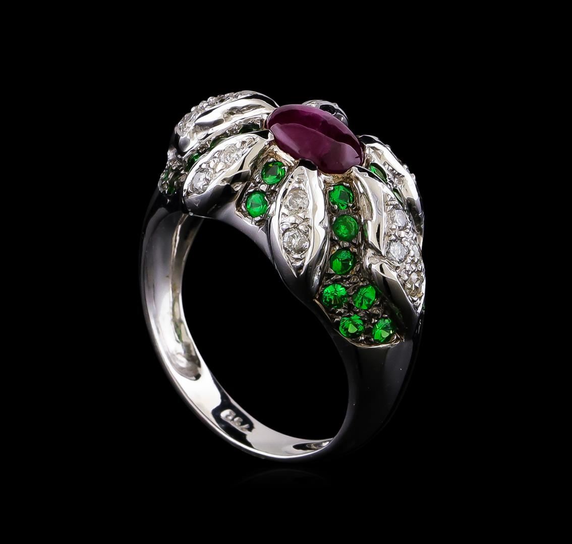 One electronically tested 18KT white gold ladies cast ruby, tsavorite garnet and diamond ring. The ring features a ruby cabochon center set within draping tsavorite garnet and diamond ribbons, completed by a three millimeter wide band. Bright and anodized finish. Identified with markings of "750". Condition is good. Containing: One prong set oval cabochon cut natural ruby, measuring 7.20 x 5.00 x 3.45mm, approximate weight of 1.40ct., type II, dark, very slightly brownish, slightly purplish red color, (GIA slpR 7/3), cut is good. Transmitting light diffusely, translucent to opaque. Naturally occurring internal & external characteristics are present. Graded in the setting. Twenty-eight bead set round mixed cut natural tsavorite garnets, measuring 1.70 - 1.60 x 1.07 mm, approximate total weight of 0.66ct., clarity is eye clean, type II, medium dark, moderately strong, slightly yellowish green color, (GIA slyG 6/4), cut is good. Transmitting light with no distortion, transparent. Color grade is an average for the group. Graded in the setting. Sixteen bead set round brilliant cut diamonds, measuring 1.70 - 1.60 x 0.99mm (depth est.) approximate total weight of 16 Stones = 0.32ct. Graded in the setting. Clarity: I-1 to I-2. Color: H - J. Total Weight of Colored Stones 2.06ct. Total Weight of Diamonds 0.32ct. Total Weight of Ring 7.98gm. AIG Appraised at $3,645.00.