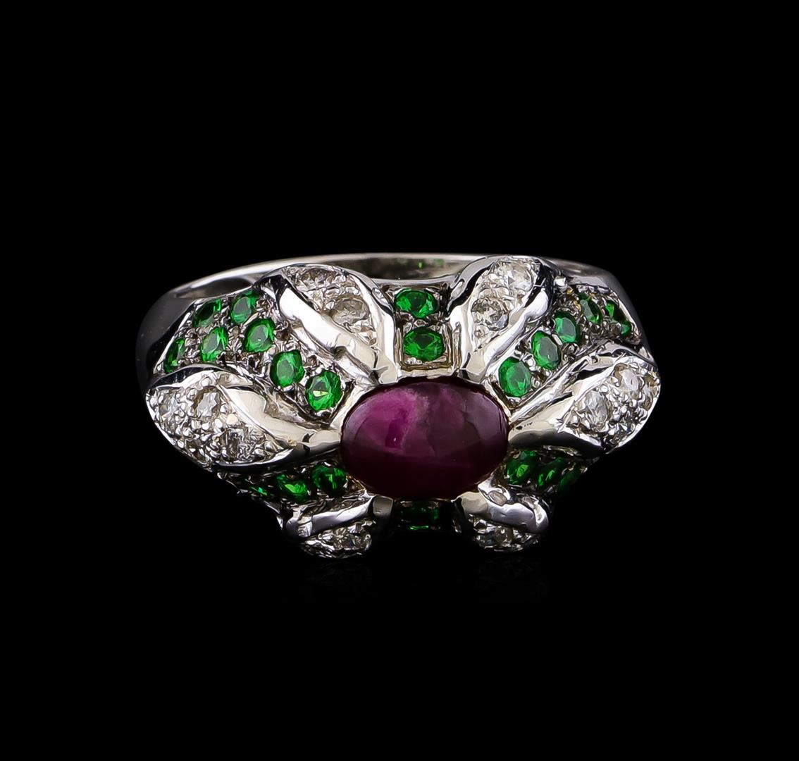 One electronically tested 18KT white gold ladies cast ruby, tsavorite garnet and diamond ring. The ring features a ruby cabochon center set within draping tsavorite garnet and diamond ribbons, completed by a three millimeter wide band. Bright and anodized finish. Identified with markings of "750". Condition is good. Containing: One prong set oval cabochon cut natural ruby, measuring 7.20 x 5.00 x 3.45mm, approximate weight of 1.40ct., type II, dark, very slightly brownish, slightly purplish red color, (GIA slpR 7/3), cut is good. Transmitting light diffusely, translucent to opaque. Naturally occurring internal & external characteristics are present. Graded in the setting. Twenty-eight bead set round mixed cut natural tsavorite garnets, measuring 1.70 - 1.60 x 1.07 mm, approximate total weight of 0.66ct., clarity is eye clean, type II, medium dark, moderately strong, slightly yellowish green color, (GIA slyG 6/4), cut is good. Transmitting light with no distortion, transparent. Color grade is an average for the group. Graded in the setting. Sixteen bead set round brilliant cut diamonds, measuring 1.70 - 1.60 x 0.99mm (depth est.) approximate total weight of 16 Stones = 0.32ct. Graded in the setting. Clarity: I-1 to I-2. Color: H - J. Total Weight of Colored Stones 2.06ct. Total Weight of Diamonds 0.32ct. Total Weight of Ring 7.98gm. AIG Appraised at $3,645.00.