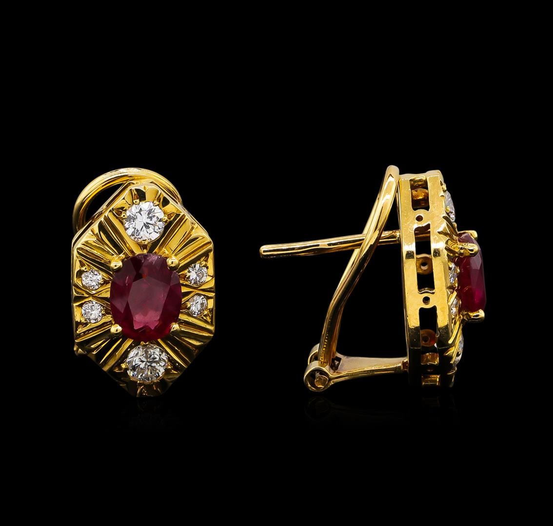 One pair electronically tested 18KT yellow gold ladies cast & assembled ruby and diamond earrings with omega backs. Each earring features a ruby set within a stylized diamond set gallery. Bright polish and patterned finish. Identified with markings of "18K". Condition is good. Containing: Two prong set oval mixed cut natural rubies, measuring 6.15 x 4.90 x 2.65mm, 5%. bulge factor, approximate total weight of 1.40ct., clarity is slightly included, type II, medium dark, very slightly brownish, slightly purplish red color, (GIA slpR 6/3), cut is good. Transmitting light with a minimum of distortion, transparent. Naturally occurring internal & external characteristics are present. Color grade is an average for the pair. Graded in the setting. Four prong set round brilliant cut diamonds, measuring 2.90 - 2.80 x 1.71mm (depth est.) approximate total weight of 4 Stones = 0.34ct. Graded in the setting. Clarity: SI-2 to I-2. Color: E - F Eight prong set round brilliant cut diamonds, measuring 1.60 - 1.60 x 0.96mm (depth est.) approximate total weight of 8 Stones = 0.13ct. Graded in the setting. Clarity: SI-2 to I-2. Color: E - F. Total Weight of Colored Stones 1.40ct. Total Weight of Diamonds 0.47ct. Total Weight of Earrings 5.56gm. AIG Appraised at $3,815.00.
