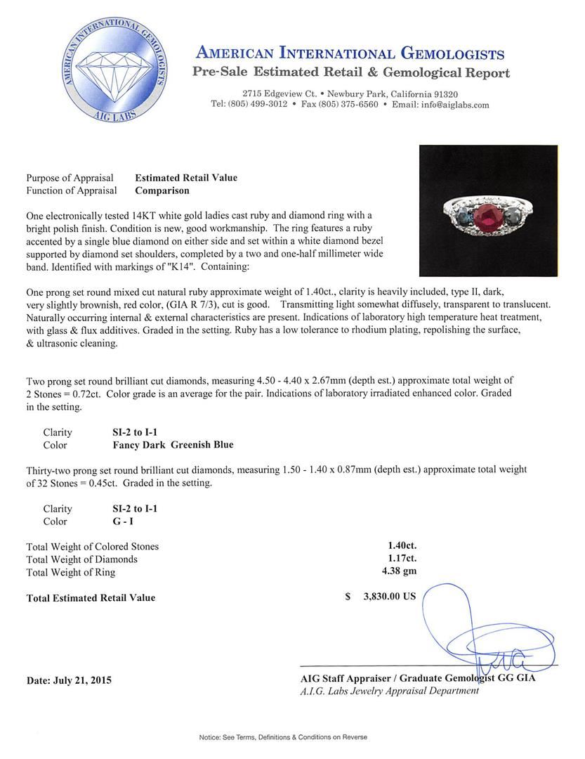 One electronically tested 14KT white gold ladies cast ruby and diamond ring with a bright polish finish. The ring features a ruby accented by a single blue diamond on either side and set within a white diamond bezel supported by diamond set shoulders, completed by a two and one-half millimeter wide band. Identified with markings of "K14". Condition is new, good workmanship. Containing: One prong set round mixed cut natural ruby approximate weight of 1.40ct., clarity is heavily included, type II, dark, very slightly brownish, red color, (GIA R 7/3), cut is good. Transmitting light somewhat diffusely, transparent to translucent. Naturally occurring internal & external characteristics are present. Indications of laboratory high temperature heat treatment, with glass & flux additives. Graded in the setting. Ruby has a low tolerance to rhodium plating, repolishing the surface, & ultrasonic cleaning. Two prong set round brilliant cut diamonds, measuring 4.50 - 4.40 x 2.67mm (depth est.) approximate total weight of 2 Stones = 0.72ct. Color grade is an average for the pair. Indications of laboratory irradiated enhanced color. Graded in the setting. Clarity SI-2 to I-1 Thirty-Two prong set round brilliant cut diamonds, measuring 1.50 - 1.40 x 0.87mm (depth est.) approximate total weight of 32 Stones = 0.45ct. Graded in the setting. Clarity SI-2 to I-1 Color G - I. Total Weight of Colored Stones 1.40ct. Total Weight of Diamonds 1.17ct. Total Weight of Ring 4.38 grams. AIG Appraised at $3,830.00.