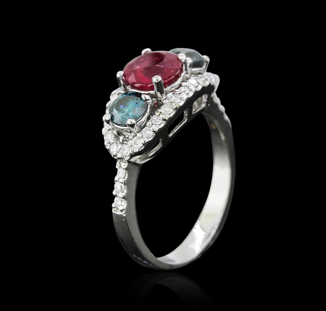 One electronically tested 14KT white gold ladies cast ruby and diamond ring with a bright polish finish. The ring features a ruby accented by a single blue diamond on either side and set within a white diamond bezel supported by diamond set shoulders, completed by a two and one-half millimeter wide band. Identified with markings of "K14". Condition is new, good workmanship. Containing: One prong set round mixed cut natural ruby approximate weight of 1.40ct., clarity is heavily included, type II, dark, very slightly brownish, red color, (GIA R 7/3), cut is good. Transmitting light somewhat diffusely, transparent to translucent. Naturally occurring internal & external characteristics are present. Indications of laboratory high temperature heat treatment, with glass & flux additives. Graded in the setting. Ruby has a low tolerance to rhodium plating, repolishing the surface, & ultrasonic cleaning. Two prong set round brilliant cut diamonds, measuring 4.50 - 4.40 x 2.67mm (depth est.) approximate total weight of 2 Stones = 0.72ct. Color grade is an average for the pair. Indications of laboratory irradiated enhanced color. Graded in the setting. Clarity SI-2 to I-1 Thirty-Two prong set round brilliant cut diamonds, measuring 1.50 - 1.40 x 0.87mm (depth est.) approximate total weight of 32 Stones = 0.45ct. Graded in the setting. Clarity SI-2 to I-1 Color G - I. Total Weight of Colored Stones 1.40ct. Total Weight of Diamonds 1.17ct. Total Weight of Ring 4.38 grams. AIG Appraised at $3,830.00.