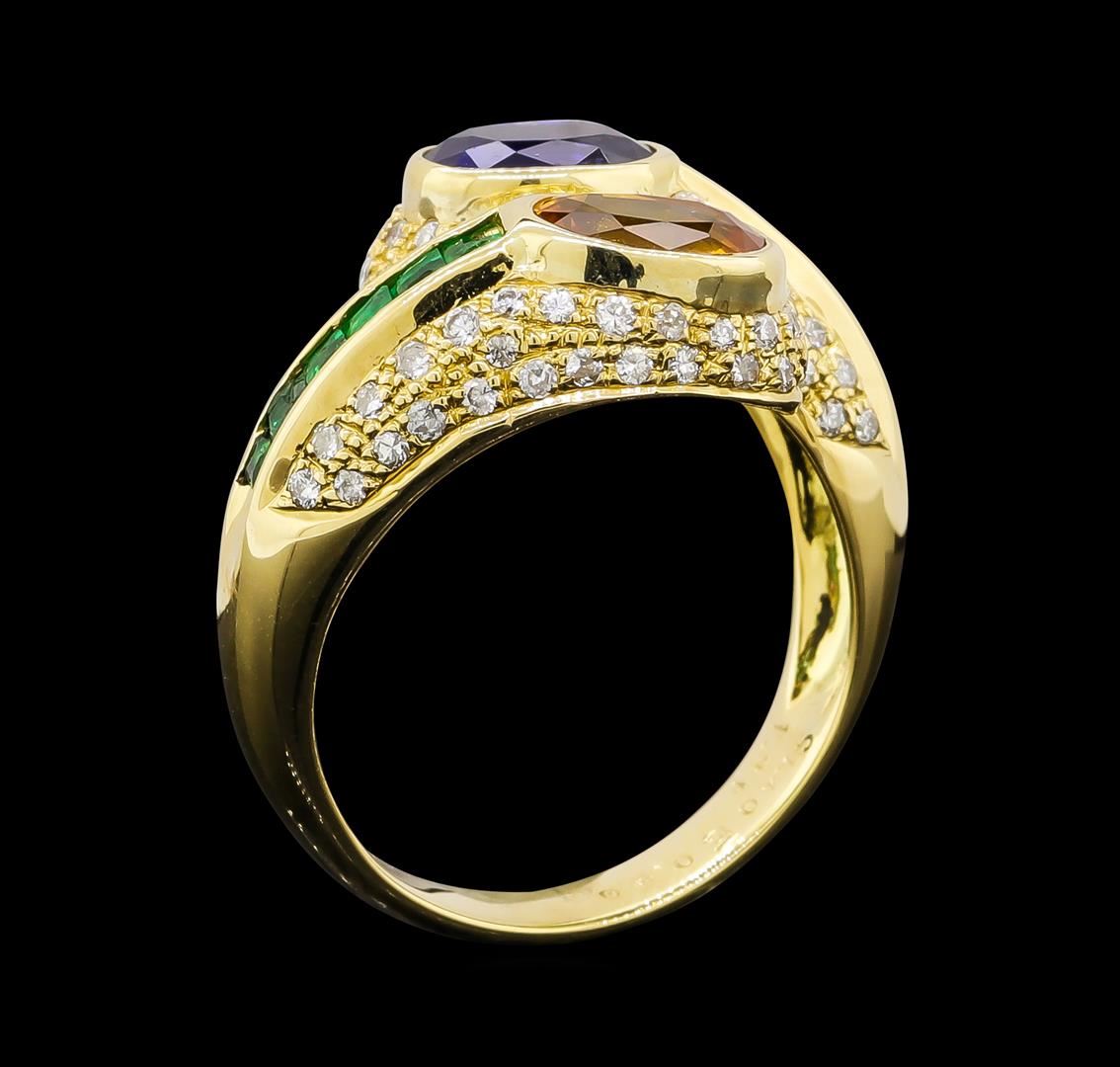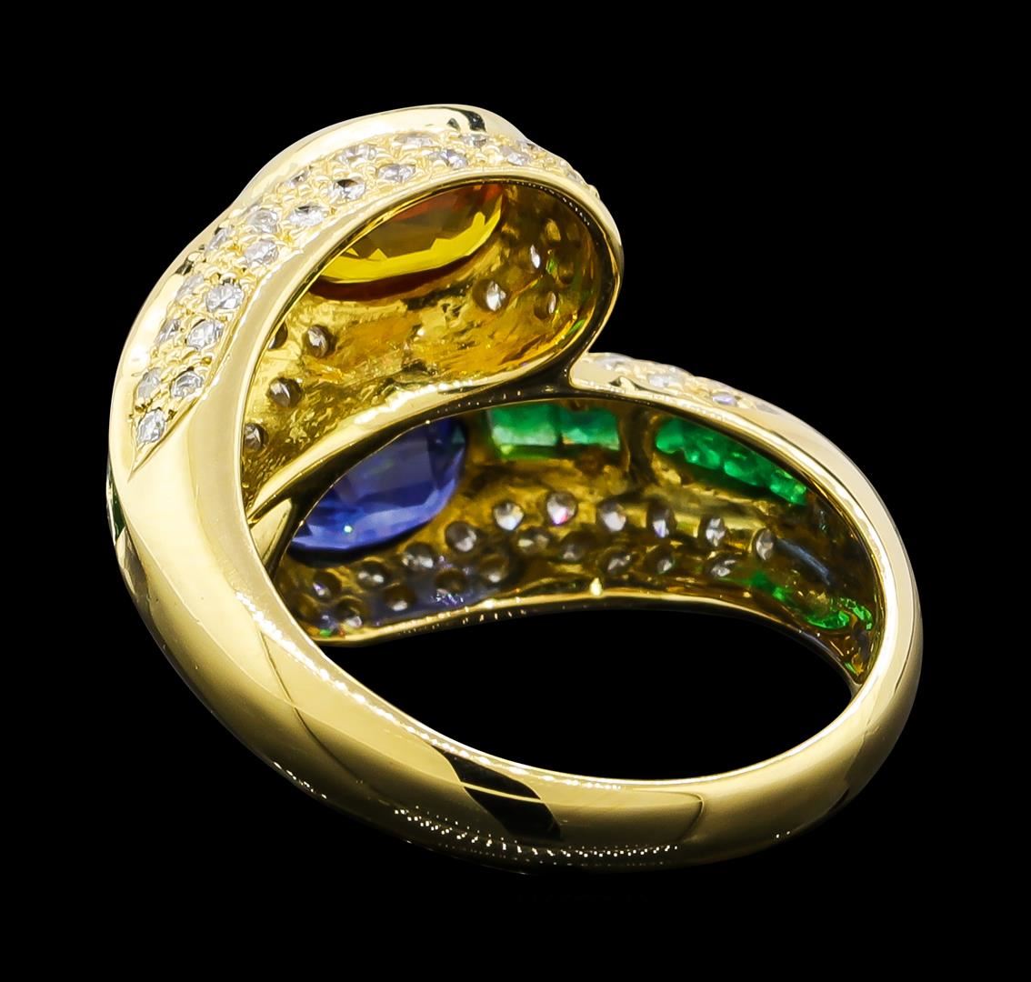 One ring featuring: 18KT Yellow Gold containing Sapphire with a total weight of 1.40ct, Emerald with a total weight of 0.40ct, and Diamonds with a total weight of 1.21ct. Total Weight of Ring: 6.9 grams.