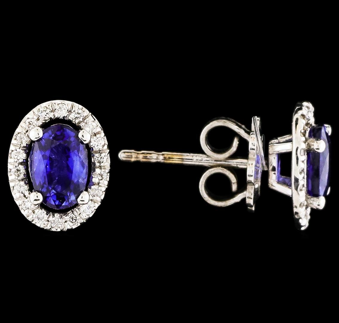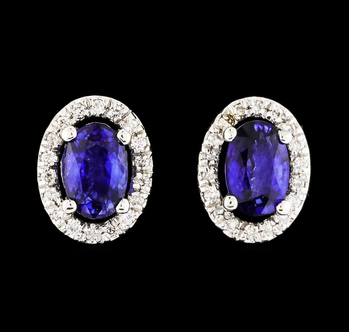 One pair of Sapphire and Diamond Earrings featuring: 14KT White Gold with a total weight of 2.40 grams, Two Sapphire Stones with a total weight of 1.40ctw, and 36 Diamonds with a total weight of 0.18ctw.