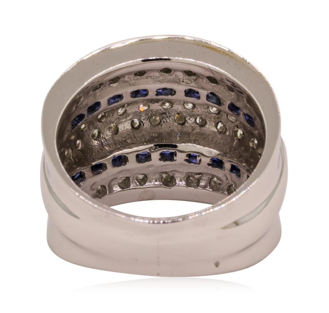 One electronically tested 14KT white gold lady's cast fashion five row band with a tapered shank with a bright polish finish. The featured lady's ring has domed center motif and a shank measuring 6.25 millimeters wide. Identified with markings of '14K'. Condition is like new, good workmanship. Containing: Thirty channel set princess modified brilliant cut natural blue sapphires, measuring 1.60 x 1.50 x 0.98mm, (depth est.) approximate total weight of 0.50ct., clarity is slightly included, medium, moderately strong, violetish blue color, (GIA vB 5/4), cut is good. Transmitting light with a minimum of distortion, transparent. Colored gemstones are presumed to have been subjected to commonly used enhancement processes. Graded in the setting. Twenty-Four channel set round brilliant cut diamonds, measuring 2.00 - 1.80 x 1.18mm (depth est.) approximate total weight of 24 Stones = 0.65ct. Graded in the setting. Color H - I Clarity SI-1 to I-1 Cut Good Thirty-Seven prong set round brilliant cut diamonds, measuring 2.00 - 1.50 x 1.09mm (depth est.) approximate total weight of 37 Stones = 0.75ct. Graded in the setting. Color H - J Clarity SI-1 to I-1 Cut Good. Total Weight of Colored Stones 0.50ct.. Total Weight of Diamonds 1.40ct.. Total Weight of Band 12.90gm GAS Appraised at $4425.00. GAS Appraised at $4,425.00.