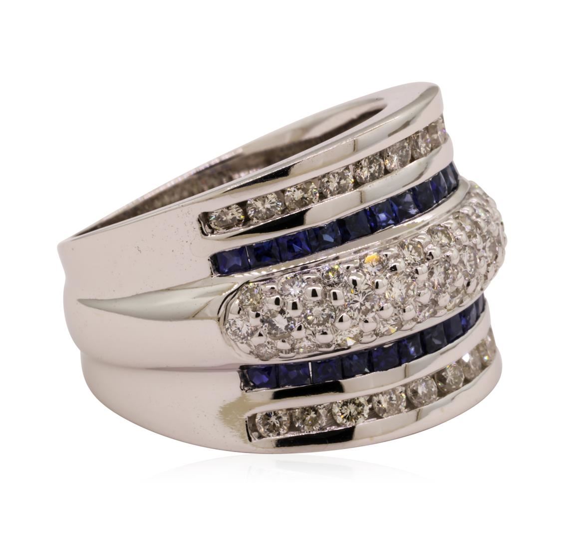 One electronically tested 14KT white gold lady's cast fashion five row band with a tapered shank with a bright polish finish. The featured lady's ring has domed center motif and a shank measuring 6.25 millimeters wide. Identified with markings of '14K'. Condition is like new, good workmanship. Containing: Thirty channel set princess modified brilliant cut natural blue sapphires, measuring 1.60 x 1.50 x 0.98mm, (depth est.) approximate total weight of 0.50ct., clarity is slightly included, medium, moderately strong, violetish blue color, (GIA vB 5/4), cut is good. Transmitting light with a minimum of distortion, transparent. Colored gemstones are presumed to have been subjected to commonly used enhancement processes. Graded in the setting. Twenty-Four channel set round brilliant cut diamonds, measuring 2.00 - 1.80 x 1.18mm (depth est.) approximate total weight of 24 Stones = 0.65ct. Graded in the setting. Color H - I Clarity SI-1 to I-1 Cut Good Thirty-Seven prong set round brilliant cut diamonds, measuring 2.00 - 1.50 x 1.09mm (depth est.) approximate total weight of 37 Stones = 0.75ct. Graded in the setting. Color H - J Clarity SI-1 to I-1 Cut Good. Total Weight of Colored Stones 0.50ct.. Total Weight of Diamonds 1.40ct.. Total Weight of Band 12.90gm GAS Appraised at $4425.00. GAS Appraised at $4,425.00.