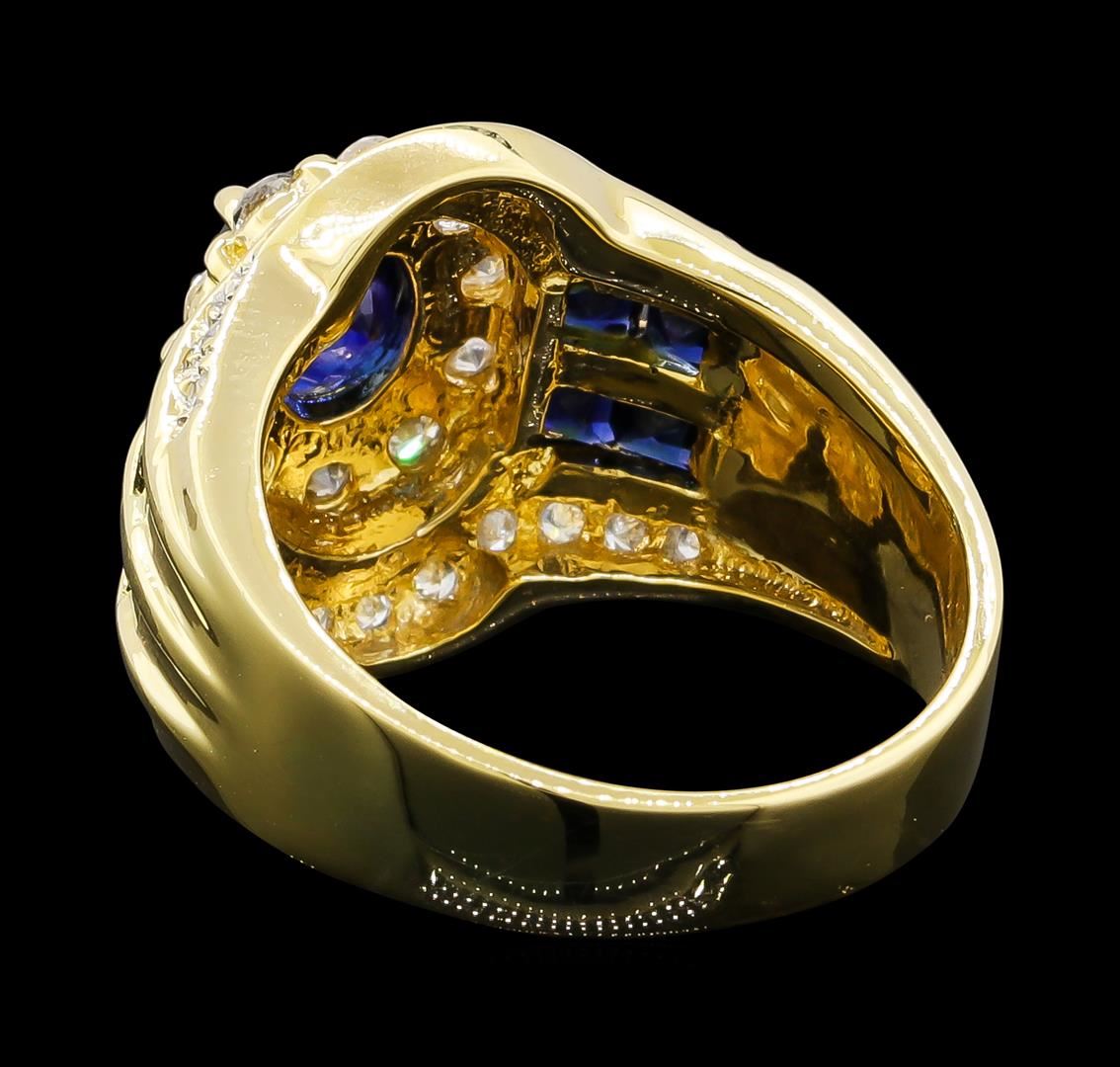 One ring featuring: 18KT Yellow Gold containing Sapphire with a total weight of 1.40ct and Diamonds with a total weight of 0.63ct. Total Weight of Ring: 10.2 grams.