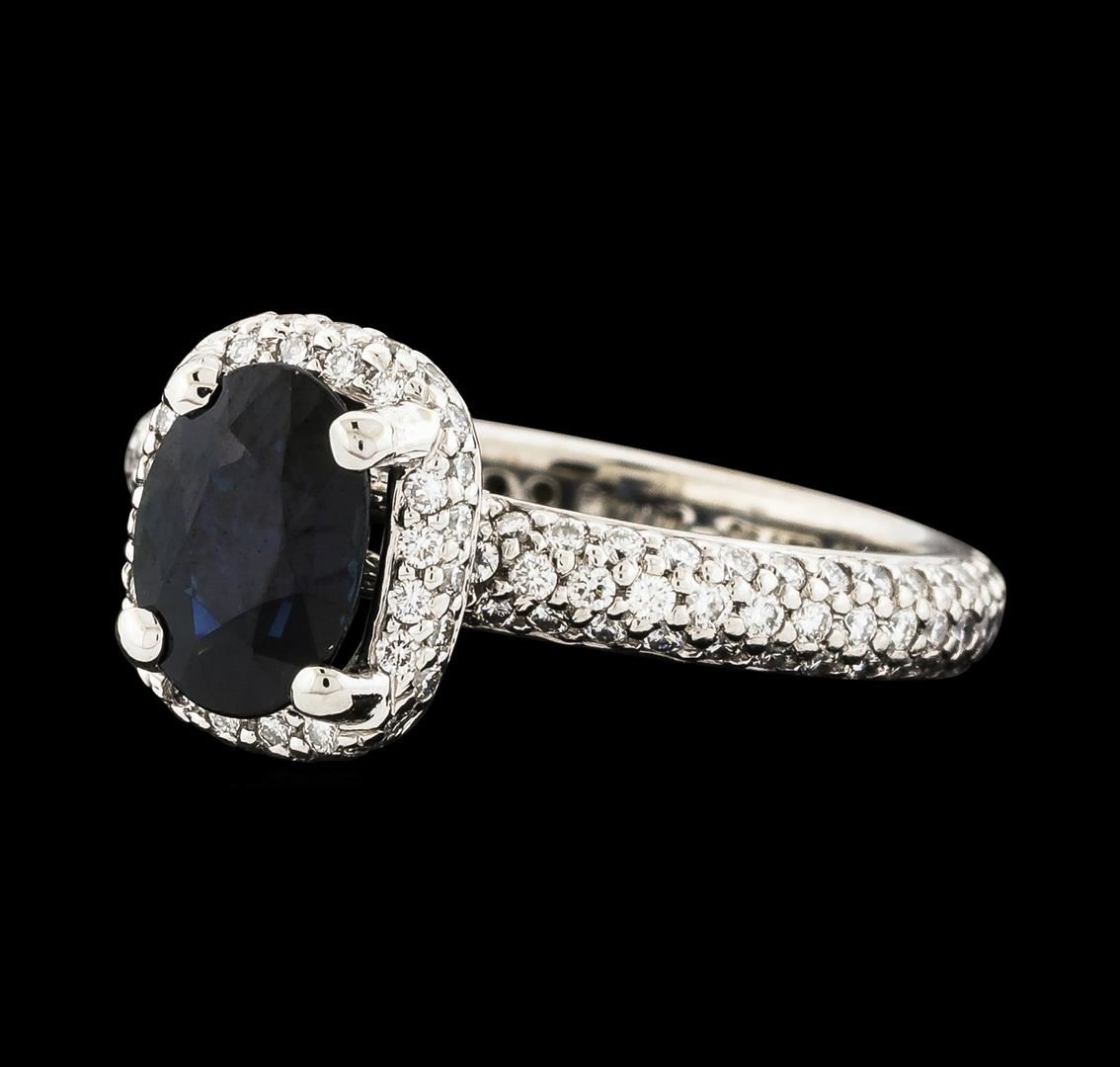 One electronically tested platinum lady's cast fashion ring with a basket halo with a bright polish finish. The featured lady's eternity ring has a shank measuring 2.73 millimeters wide. Trademark is RITANI. Identified with markings of 'PT 950'. Condition is like new, good workmanship. Containing: One prong set oval modified brilliant cut natural blue sapphire, measuring 7.98 x 5.85 x 3.62mm, (depth est.) approximate weight of 1.40ct., clarity is slightly included, medium dark, moderately strong, blue color, (GIA B 6/4), cut is very good. Transmitting light somewhat diffusely, transparent to translucent. Colored gemstones are presumed to have been subjected to commonly used enhancement processes. Graded in the setting. One Hundred Seventy-Nine prong set round brilliant cut diamonds, measuring 1.25 - 1.15 x 0.74mm (depth est.) approximate total weight of 179 Stones = 1.20ct. Graded in the setting. Clarity VS-1 to VS-2. Color: F - G Cut Very Good. Total Weight of Colored Stones 1.40ct.. Total Weight of Diamonds 1.20ct.. Total Weight of Ring 5.50gm. GAS Appraised at $7,690.00.