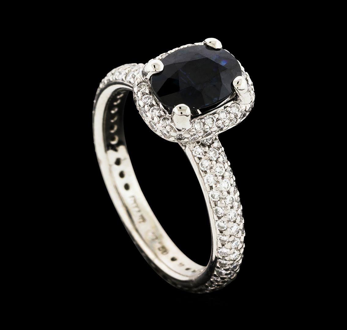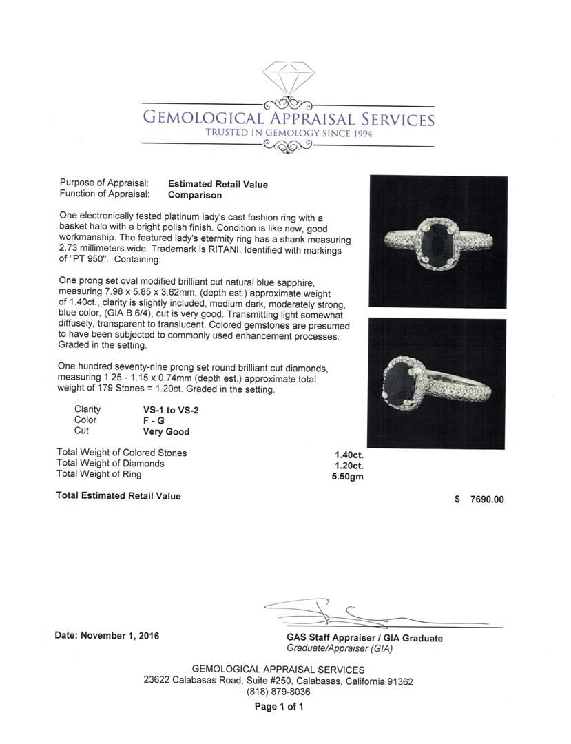 One electronically tested platinum lady's cast fashion ring with a basket halo with a bright polish finish. The featured lady's eternity ring has a shank measuring 2.73 millimeters wide. Trademark is RITANI. Identified with markings of 'PT 950'. Condition is like new, good workmanship. Containing: One prong set oval modified brilliant cut natural blue sapphire, measuring 7.98 x 5.85 x 3.62mm, (depth est.) approximate weight of 1.40ct., clarity is slightly included, medium dark, moderately strong, blue color, (GIA B 6/4), cut is very good. Transmitting light somewhat diffusely, transparent to translucent. Colored gemstones are presumed to have been subjected to commonly used enhancement processes. Graded in the setting. One Hundred Seventy-Nine prong set round brilliant cut diamonds, measuring 1.25 - 1.15 x 0.74mm (depth est.) approximate total weight of 179 Stones = 1.20ct. Graded in the setting. Clarity VS-1 to VS-2. Color: F - G Cut Very Good. Total Weight of Colored Stones 1.40ct.. Total Weight of Diamonds 1.20ct.. Total Weight of Ring 5.50gm. GAS Appraised at $7,690.00.