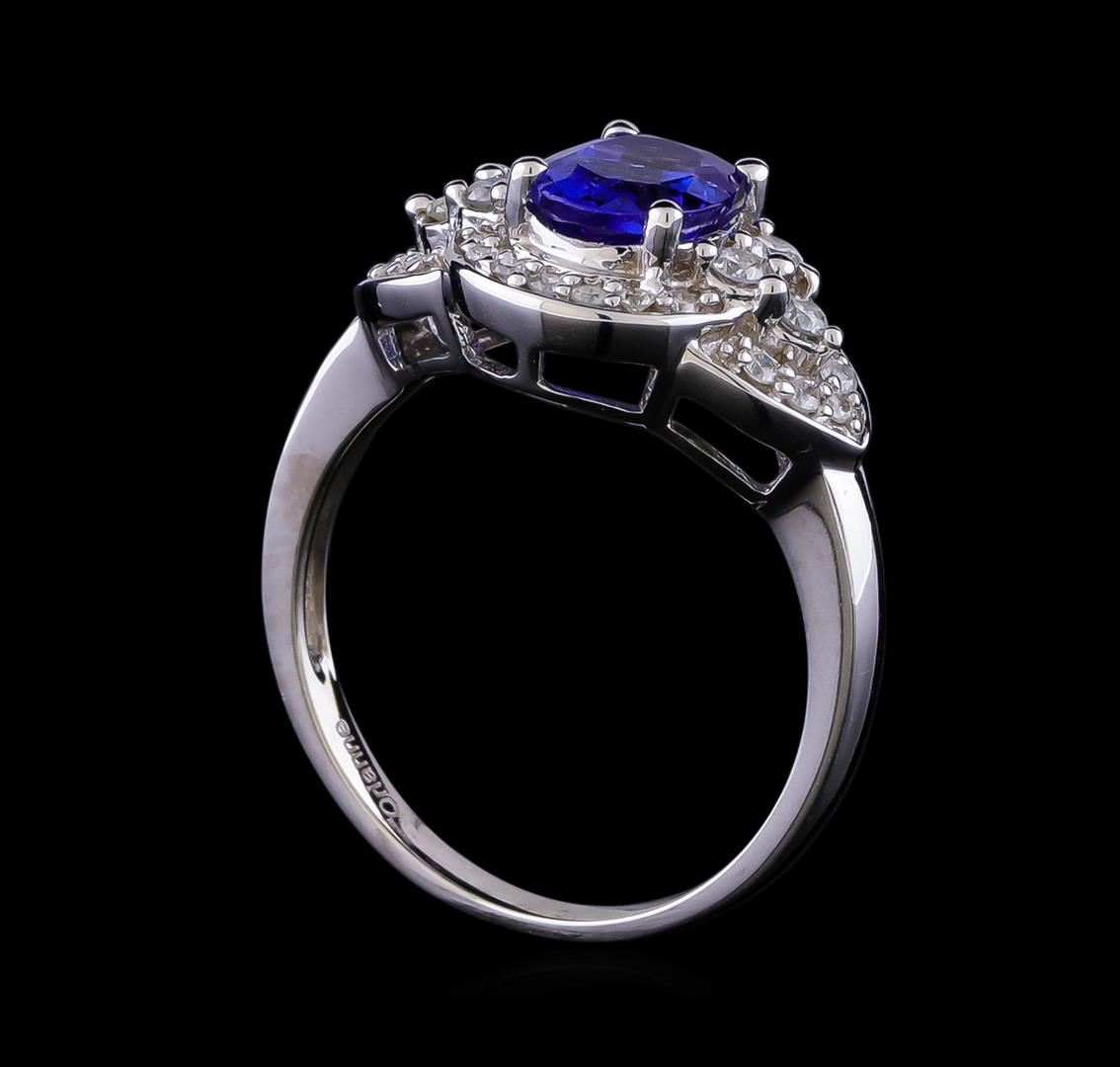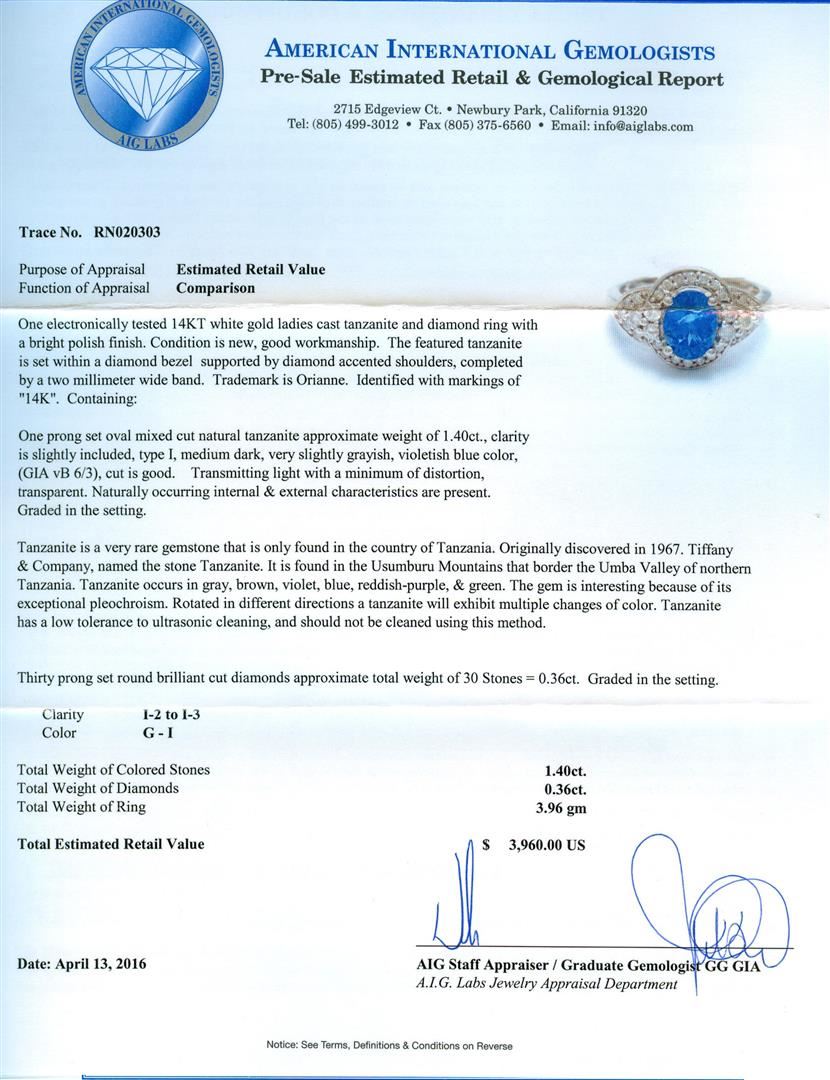 One electronically tested 14KT white gold ladies cast tanzanite and diamond ring with a bright polish finish. The featured tanzanite is set within a diamond bezel supported by diamond accented shoulders, completed by a two millimeter wide band. Trademark is Orianne. Identified with markings of "14K". Condition is new, good workmanship. Containing: One prong set oval mixed cut natural tanzanite approximate weight of 1.40ct., clarity is slightly included, type I, medium dark, very slightly grayish, violetish blue color, (GIA vB 6/3), cut is good. Transmitting light with a minimum of distortion, transparent. Naturally occurring internal & external characteristics are present. Graded in the setting. Tanzanite is a very rare gemstone that is only found in the country of Tanzania. Originally discovered in 1967. Tiffany & Company, named the stone Tanzanite. It is found in the Usumburu Mountains that border the Umba Valley of northern Tanzania. Tanzanite occurs in gray, brown, violet, blue, reddish-purple, & green. The gem is interesting because of its exceptional pleochroism. Rotated in different directions a tanzanite will exhibit multiple changes of color. Tanzanite has a low tolerance to ultrasonic cleaning, and should not be cleaned using this method. Thirty prong set round brilliant cut diamonds approximate total weight of 30 Stones = 0.36ct. Graded in the setting. Clarity: I-2 to I-3. Color: G - I. Total Weight of Colored Stones 1.40ct. Total Weight of Diamonds 0.36ct. Total Weight of Ring 3.96gm. AIG Appraised at $3,960.00.