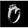 One electronically tested 18KT white and yellow gold lady's cast fashion ring with a knife edge shank with a bright polish with milgrain detailing finish. The featured lady's ring has a shank measuring 2.70 millimeters wide. Identified with markings of "18K". Condition is new, good workmanship. Containing: One prong set oval modified brilliant cut natural tanzanite, measuring 8.13 x 6.06 x 3.94mm, approximate weight of 1.40ct., clarity is eye clean, type I, medium, very slightly grayish, bluish violet color, (GIA bV 5/3), cut is good. Transmitting light with no distortion, transparent. Colored gemstones are presumed to have been subjected to commonly used enhancement processes. Graded in the setting. Seventy prong set round brilliant cut diamonds, measuring 1.30 - 1.20 x 0.81mm (depth est.) approximate total weight of 70 Stones = 0.54ct. Graded in the setting. Clarity: VS-2 to SI-1. Color: G - Good. Total Weight of Colored Stones 1.40ct. Total Weight of Diamonds 0.54ct. Total Weight of Ring 6.10gm. GAS Appraised at $4,855.00.