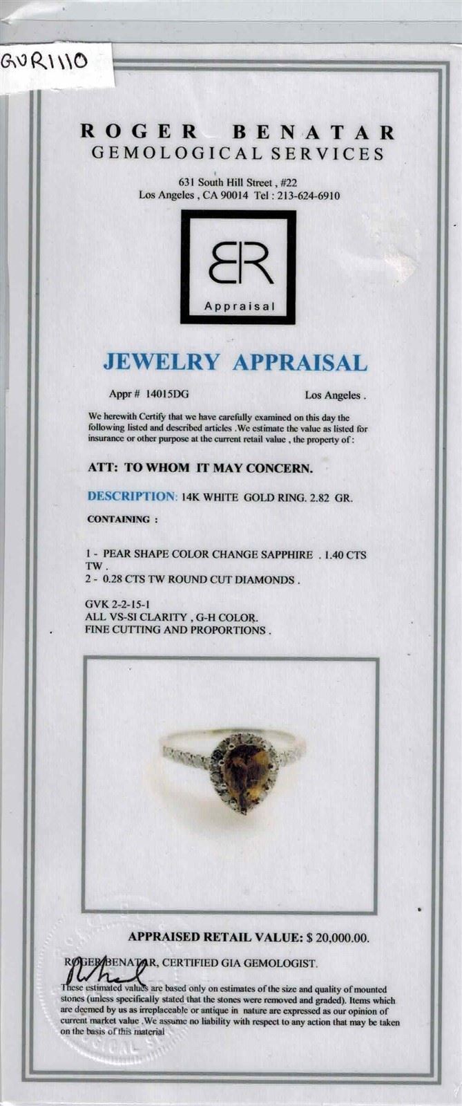 14K WHITE GOLD NATURAL CEYLON COLOR CHANGE SAPPHIRE RING:2.82 grams/DIAMOND:0.28 CT/COLOR CHANGE SAPPHIRE:1.40CT/#GVR1110 ***Warmly crafted in 14kt white gold, this handsome style features a 1.40ct Pear Shape Color Change Sapphire center stone, a gemstone of prospertity and health. Framed with shimmering 0.28ct Round Cut Diamonds, with detailing along the shank, this cocktail ring is an investment piece; a touch of subtle sparkle adds to its richness and depth.**