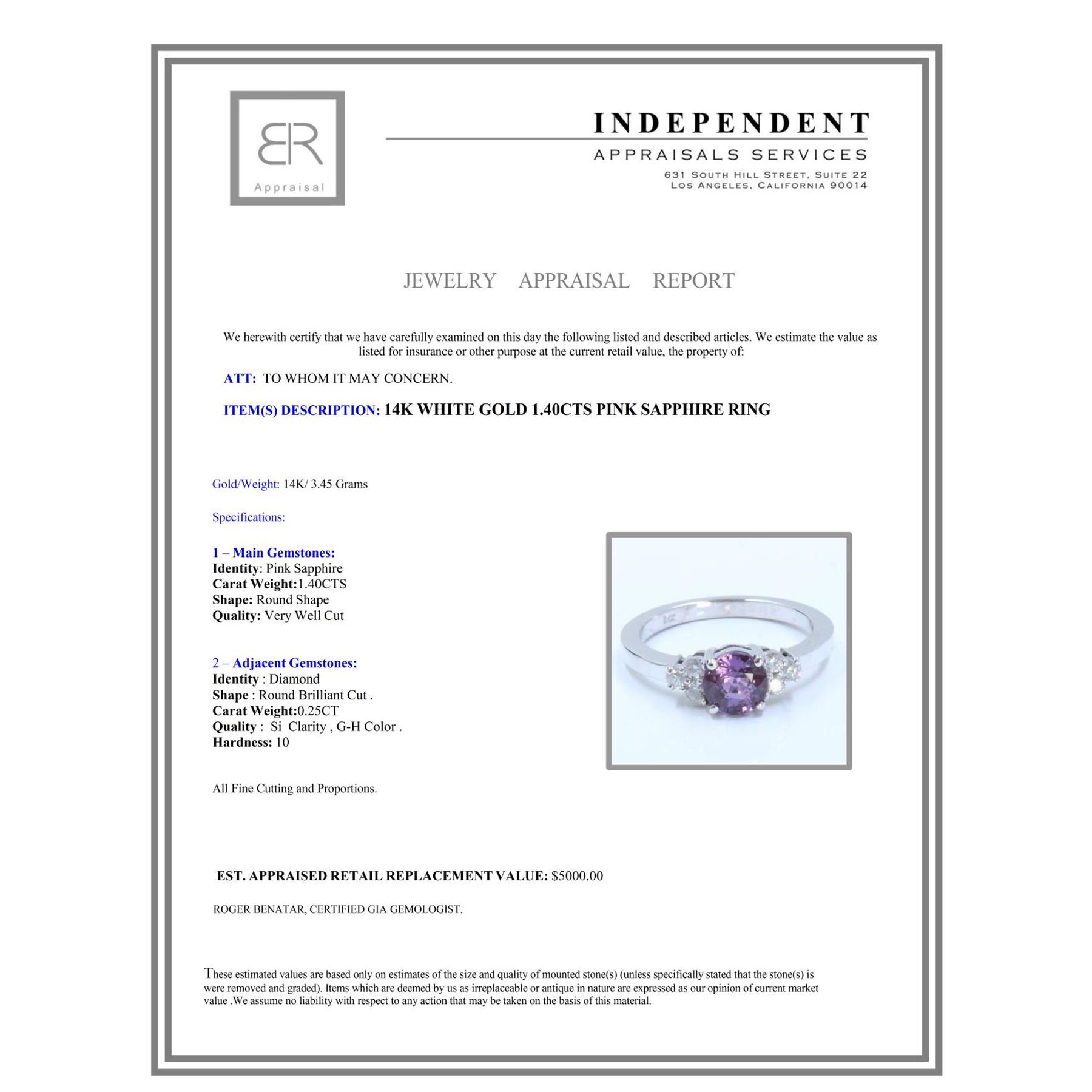 14K WHITE GOLD NATURAL CEYLON PINK SAPPHIRE RING3.45GRAMS/DIAMOND0.25CT/PINK SAPPHIRE:1.40CT/#GVR1068 **Sapphire is a gemstone which carries a light, soothing energy for the heart chakra. This 1.40ct Round Shape Pink Sapphire gemstone casts a hue the color of a dawn sky. Duos of shimmering 0.25ct round Brilliant Cut Diamond accents flank each side, adding a touch of subtle sparkle like planets twinkling on the horizon. **