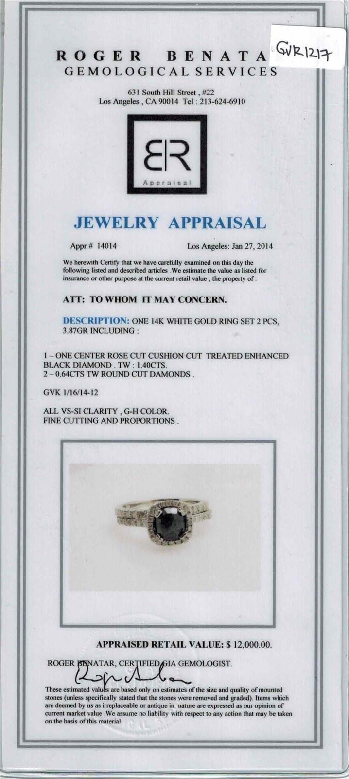 14K WHITE GOLD BLACK DIAMOND RING 2PC :3.87 GRAMS/TREATED BLACK DIAMOND:1.40CT/DIAMOND:0.64CT/#GVR1217 **This spectacular 1.40ct Rose Cut, Cushion Cut, Treated Black Diamond casts a brilliance of depth and mystery. Diamonds are known to allow one to call forth clarity of vision, radiance of Light and sovereignty of Self. A 2 piece ring, surrounded by twinkling 0.64ct round cut Diamonds, it is warmly crafted in 14K white gold. this ring is a secure purchase; drawing the eye to its bold beauty.**