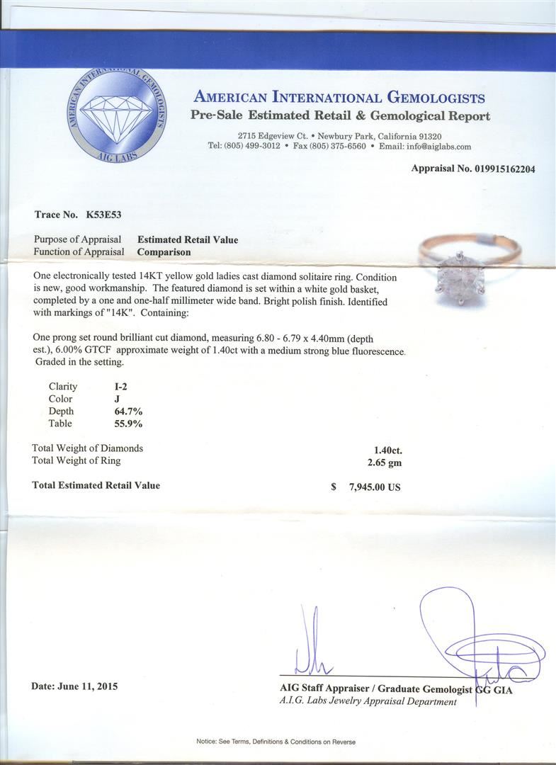 One electronically tested 14KT yellow gold ladies cast diamond solitaire ring. The featured diamond is set within a white gold basket, completed by a one and one-half millimeter wide band. Bright polish finish. Identified with markings of "14K". Condition is new, good workmanship. Containing: One prong set round brilliant cut diamond, measuring 6.80 - 6.79 x 4.40mm (depth est.), 6.00.%. GTCF approximate weight of 1.40ct with a medium strong blue fluorescence. Graded in the setting. Clarity: I-2. Color: J. Depth 64.7%. Table 55.9%. Total Weight of Diamonds 1.40ct. AIG Appraised at $7,945.00.