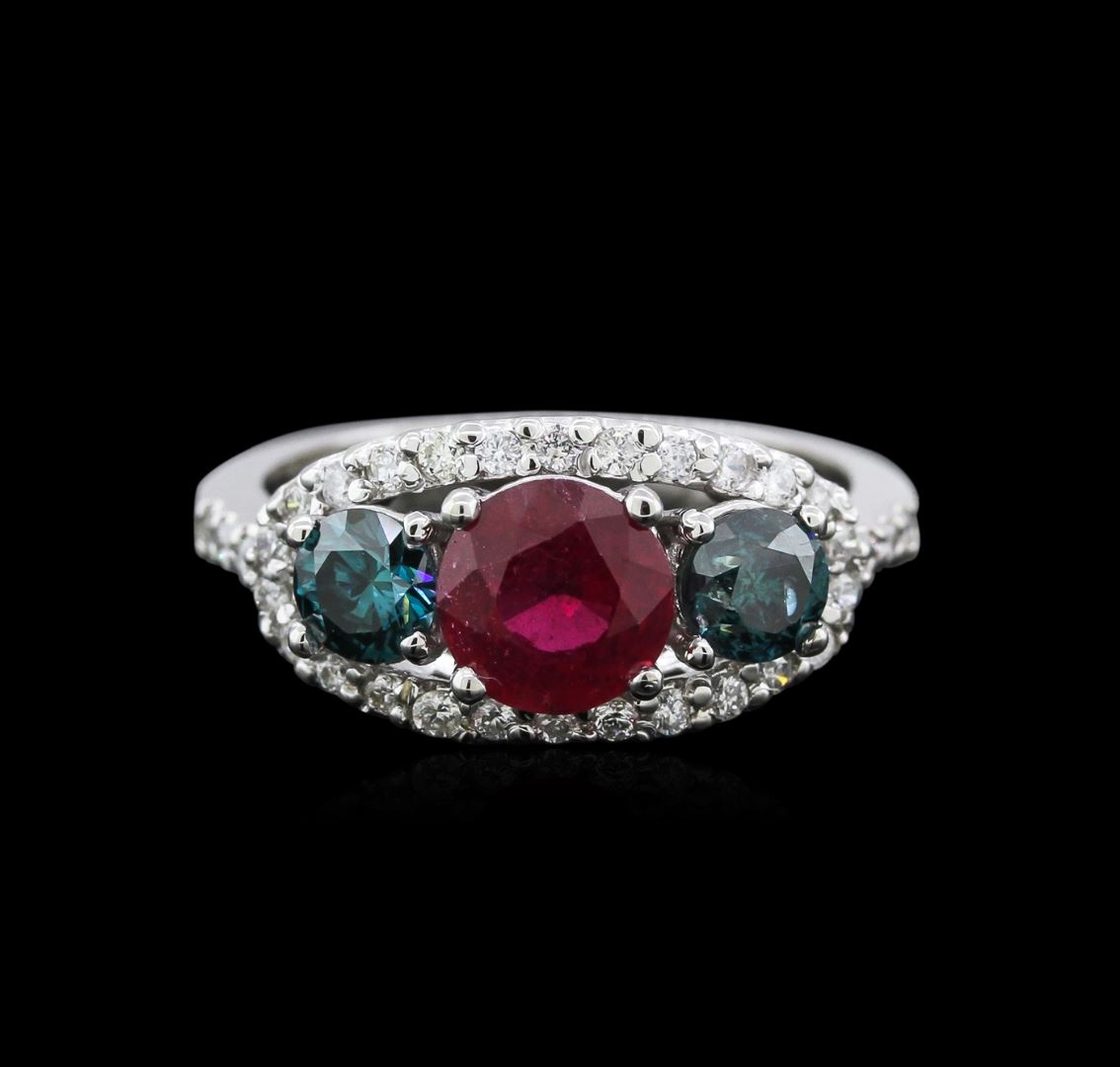 One electronically tested 14KT white gold ladies cast ruby and diamond ring with a bright polish finish. The ring features a ruby accented by a single blue diamond on either side and set within a white diamond bezel supported by diamond set shoulders, completed by a two and one-half millimeter wide band. Identified with markings of "K14". Condition is new, good workmanship. Containing: One prong set round mixed cut natural ruby approximate weight of 1.40ct., clarity is heavily included, type II, dark, very slightly brownish, red color, (GIA R 7/3), cut is good. Transmitting light somewhat diffusely, transparent to translucent. Naturally occurring internal & external characteristics are present. Indications of laboratory high temperature heat treatment, with glass & flux additives. Graded in the setting. Ruby has a low tolerance to rhodium plating, repolishing the surface, & ultrasonic cleaning. Two prong set round brilliant cut diamonds, measuring 4.50 - 4.40 x 2.67mm (depth est.) approximate total weight of 2 Stones = 0.72ct. Color grade is an average for the pair. Indications of laboratory irradiated enhanced color. Graded in the setting. Clarity SI-2 to I-1 Thirty-Two prong set round brilliant cut diamonds, measuring 1.50 - 1.40 x 0.87mm (depth est.) approximate total weight of 32 Stones = 0.45ct. Graded in the setting. Clarity SI-2 to I-1 Color G - I. Total Weight of Colored Stones 1.40ct. Total Weight of Diamonds 1.17ct. Total Weight of Ring 4.38 grams. AIG Appraised at $3,830.00.