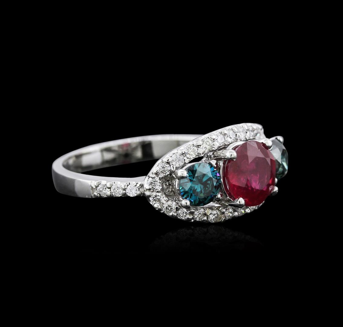 One electronically tested 14KT white gold ladies cast ruby and diamond ring with a bright polish finish. The ring features a ruby accented by a single blue diamond on either side and set within a white diamond bezel supported by diamond set shoulders, completed by a two and one-half millimeter wide band. Identified with markings of "K14". Condition is new, good workmanship. Containing: One prong set round mixed cut natural ruby approximate weight of 1.40ct., clarity is heavily included, type II, dark, very slightly brownish, red color, (GIA R 7/3), cut is good. Transmitting light somewhat diffusely, transparent to translucent. Naturally occurring internal & external characteristics are present. Indications of laboratory high temperature heat treatment, with glass & flux additives. Graded in the setting. Ruby has a low tolerance to rhodium plating, repolishing the surface, & ultrasonic cleaning. Two prong set round brilliant cut diamonds, measuring 4.50 - 4.40 x 2.67mm (depth est.) approximate total weight of 2 Stones = 0.72ct. Color grade is an average for the pair. Indications of laboratory irradiated enhanced color. Graded in the setting. Clarity SI-2 to I-1 Thirty-Two prong set round brilliant cut diamonds, measuring 1.50 - 1.40 x 0.87mm (depth est.) approximate total weight of 32 Stones = 0.45ct. Graded in the setting. Clarity SI-2 to I-1 Color G - I. Total Weight of Colored Stones 1.40ct. Total Weight of Diamonds 1.17ct. Total Weight of Ring 4.38 grams. AIG Appraised at $3,830.00.