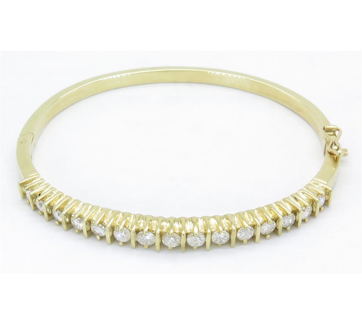 One tested 14K yellow gold diamond bangle bracelet. Containing: 15 Round Brilliant Cut Diamonds. Clarity: I, Color: G-H. Approximate total diamond weight: 1.40CTW. Diamonds are graded in the mounting, unless otherwise stated. Weight of bracelet: 17.6 grams. Size: 6.5".