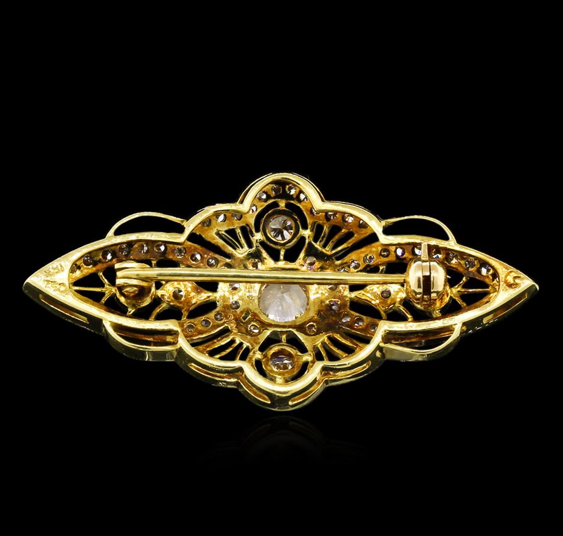 One electronically tested 18KT yellow gold lady's combination cast & assembled fashion pin with a bright polish with milgrain detailing finish. The featured pin has a vintage motif. Identified with markings of "18K 750". Condition is like new, good workmanship. Containing: One bezel set round brilliant cut diamond, measuring 4.30 - 4.20 x 2.60mm (depth est.) approximate weight of 0.29ct. Graded in the setting. Clarity: VS-2. Color: Good Four bezel set round brilliant cut diamonds, measuring 2.40 - 2.30 x 1.50mm (depth est.) approximate total weight of 4 Stones = 0.20ct. Graded in the setting. Clarity: VS-2 to SI-1. Color: G - Good Eighty prong set round brilliant cut diamonds, measuring 1.65 - 1.20 x 0.92mm (depth est.) approximate total weight of 80 Stones = 0.91ct. Graded in the setting. Clarity: VS-1 to SI-1. Color: G - Good. Total Weight of Diamonds 1.40ct. Total Weight of Pin 5.80gm. GAS Appraised at $5,125.00.