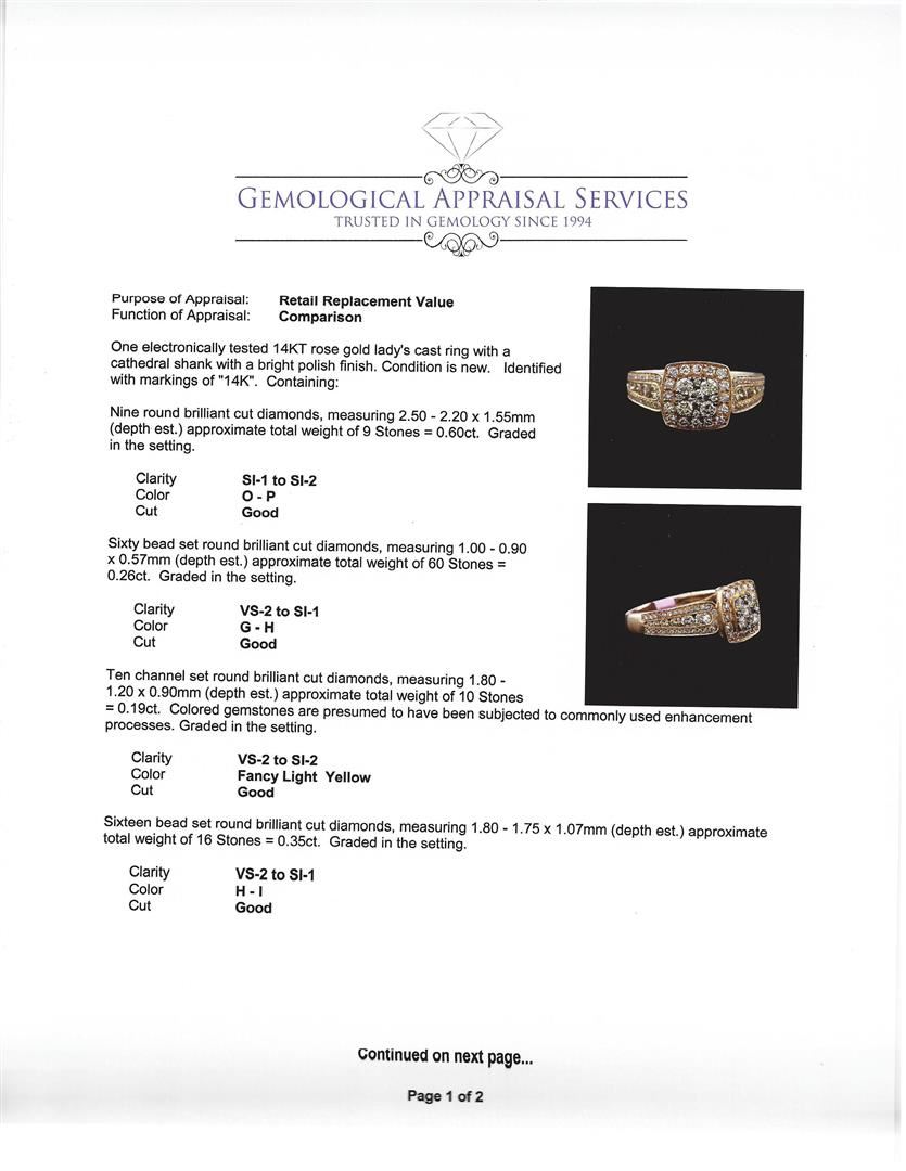 One electronically tested 14KT rose gold lady's cast ring with a cathedral shank with a bright polish finish. Condition is new. Identified with markings of "14K". Containing: Nine round brilliant cut diamonds, measuring 2.50 - 2.20 x 1.55mm (depth est.) approximate total weight of 9 Stones = 0.60ct. Graded in the setting. Clarity: SI-1 to SI-2. Color: O - P. Cut: Good. Sixty bead set round brilliant cut diamonds, measuring 1.00 - 0.90 x 0.57mm (depth est.) approximate total weight of 60 Stones = 0.26ct. Graded in the setting. Clarity: VS-2 to SI-1. Color: G - H. Cut: Good. Ten channel set round brilliant cut diamonds, measuring 1.80 - 1.20 x 0.90mm (depth est.) approximate total weight of 10 Stones = 0.19ct. Colored gemstones are presumed to have been subjected to commonly used enhancement processes. Graded in the setting. Clarity: VS-2 to SI-2. Color: Fancy Light Yellow. Cut: Good. Sixteen bead set round brilliant cut diamonds, measuring 1.80 - 1.75 x 1.07mm (depth est.) approximate total weight of 16 Stones = 0.35ct. Graded in the setting. Clarity: VS-2 to SI-1. Color: H - I. Cut: Good. Total Weight of Diamonds: 1.40ct. Total Weight of Ring: 5.00 gm. GAS Appraised at $6,070.00.