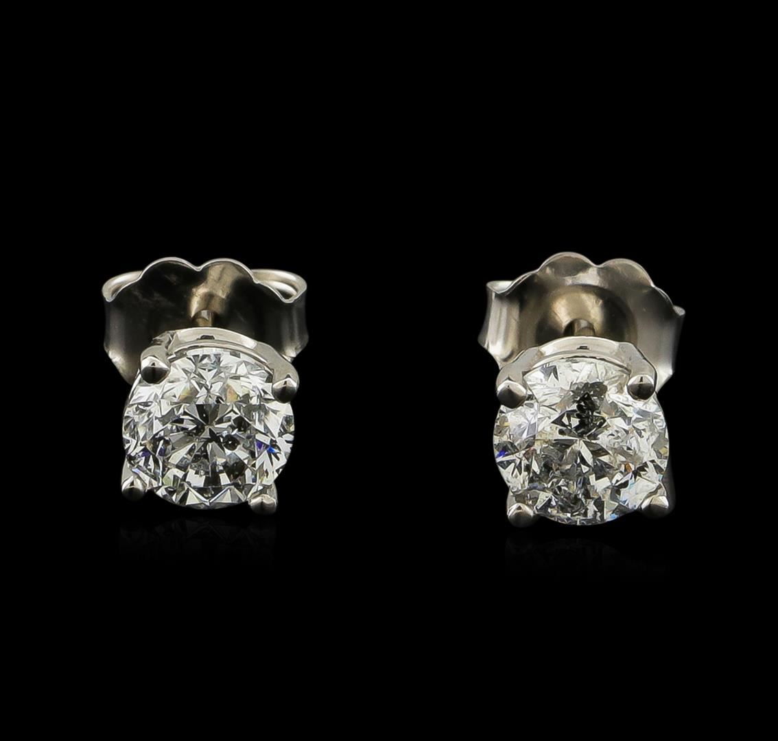 One pair electronically tested 14KT white gold cast & assembled diamond solitaire earrings with screw backs. Identified with markings of "14K". Condition is new, good workmanship. Containing: One prong set round brilliant cut diamond, measuring 5.30 - 5.20 x 3.71mm (depth est.), 10.00.%. GTCF approximate weight of 0.68ct with a medium blue fluorescence. Graded in the setting. Clarity: I-1. Color: 70.7%. Table 57.5%. One prong set round brilliant cut diamond, measuring 5.50 - 5.40 x 3.70mm (depth est.), 8.00.%. GTCF approximate weight of 0.72ct with a medium blue fluorescence. Graded in the setting. Clarity: I-2. Color: 67.9%. Table 54.9%. Total Weight of Diamonds 1.40ct. Total Weight of Earrings 1.18gm. AIG Appraised at $7,245.00.