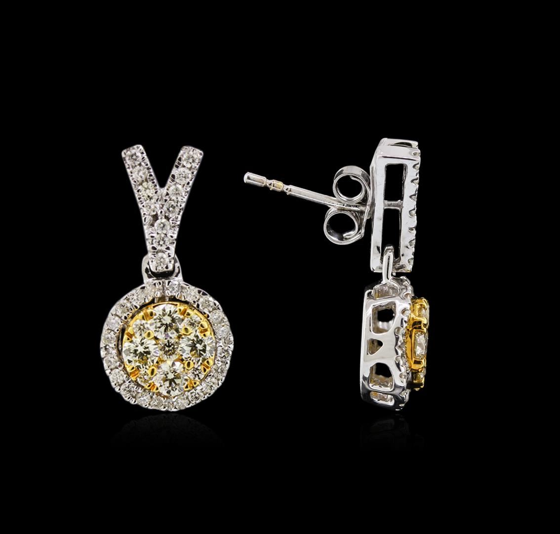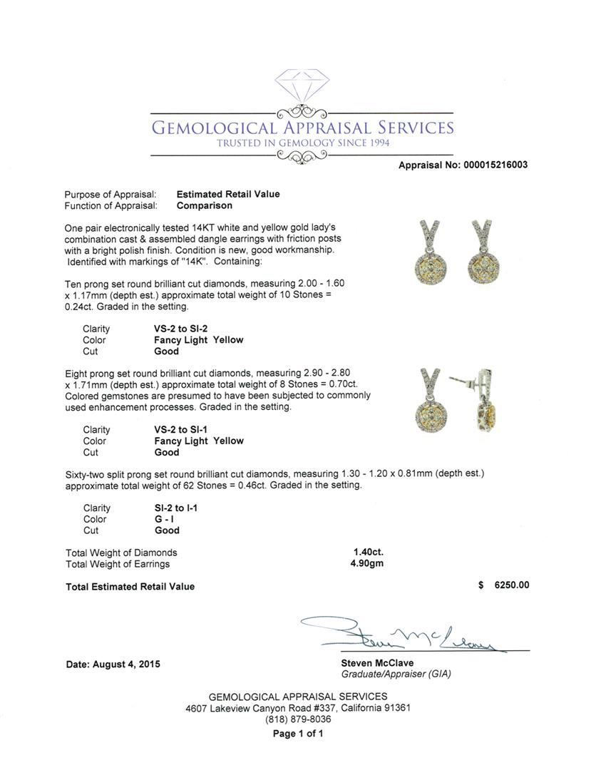 One pair electronically tested 14KT white and yellow gold lady's combination cast & assembled dangle earring with friction posts with a bright polish finish. Identified with markings of "14K". Condition is new, good workmanship. Containing: Ten prong set round brilliant cut diamonds, measuring 2.00 - 1.60 x 1.17mm (depth est.) approximate total weight of 10 Stones = 0.24ct. Graded in the setting. Clarity VS-2 to SI-2 Cut Good Eight prong set round brilliant cut diamonds, measuring 2.90 - 2.80 x 1.71mm (depth est.) approximate total weight of 8 Stones = 0.70ct. Colored gemstones are presumed to have been subjected to commonly used enhancement processes. Graded in the setting. Clarity VS-2 to SI-1 Cut Good Sixty-Two split prong set round brilliant cut diamonds, measuring 1.30 - 1.20 x 0.81mm (depth est.) approximate total weight of 62 Stones = 0.46ct. Graded in the setting. Clarity SI-2 to I-1 Color G - I. Cut Good Total Weight of Diamonds 1.40ct. Total Weight of Earring 4.90gm GAS Appraised at $6,250.00.