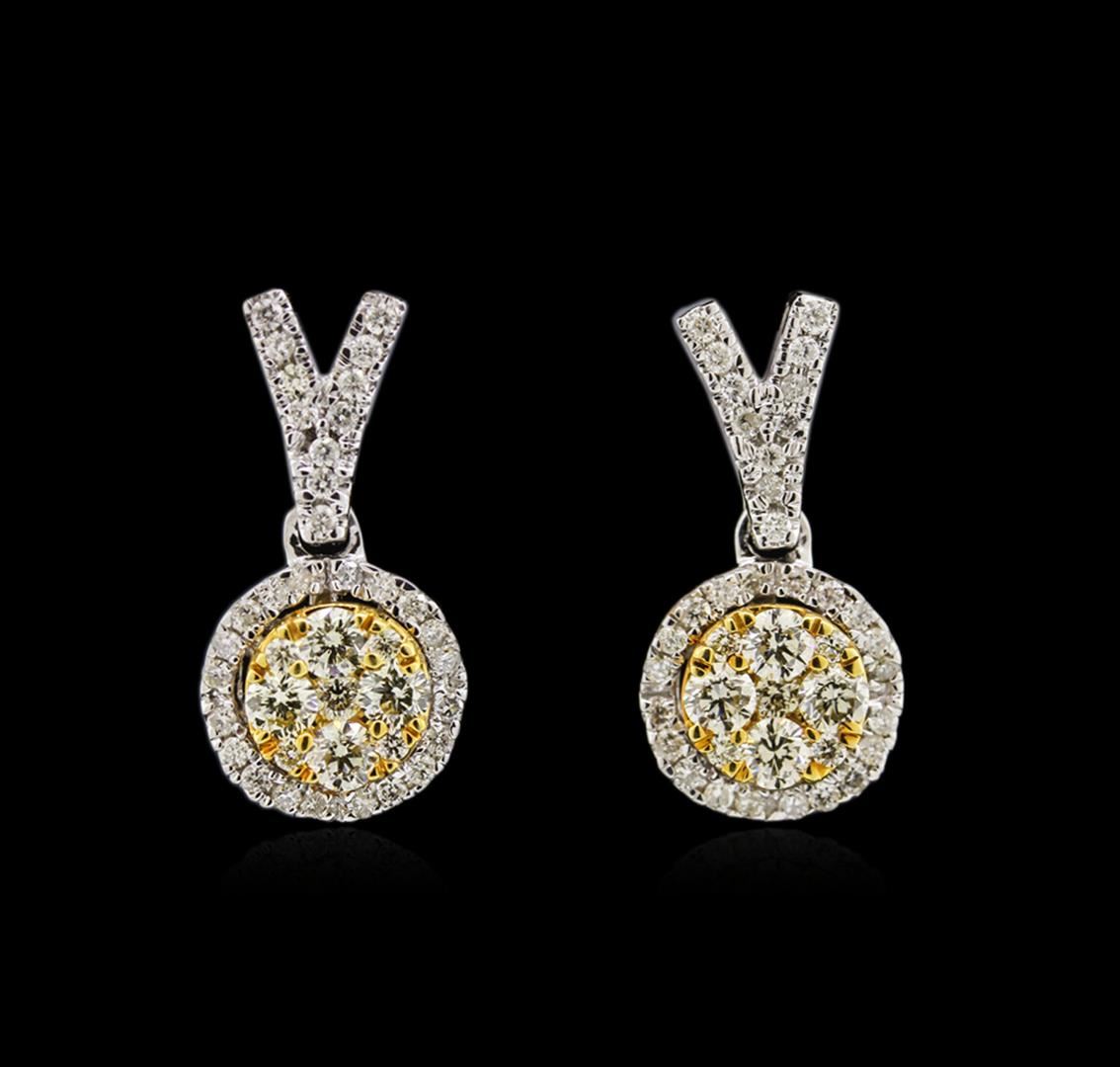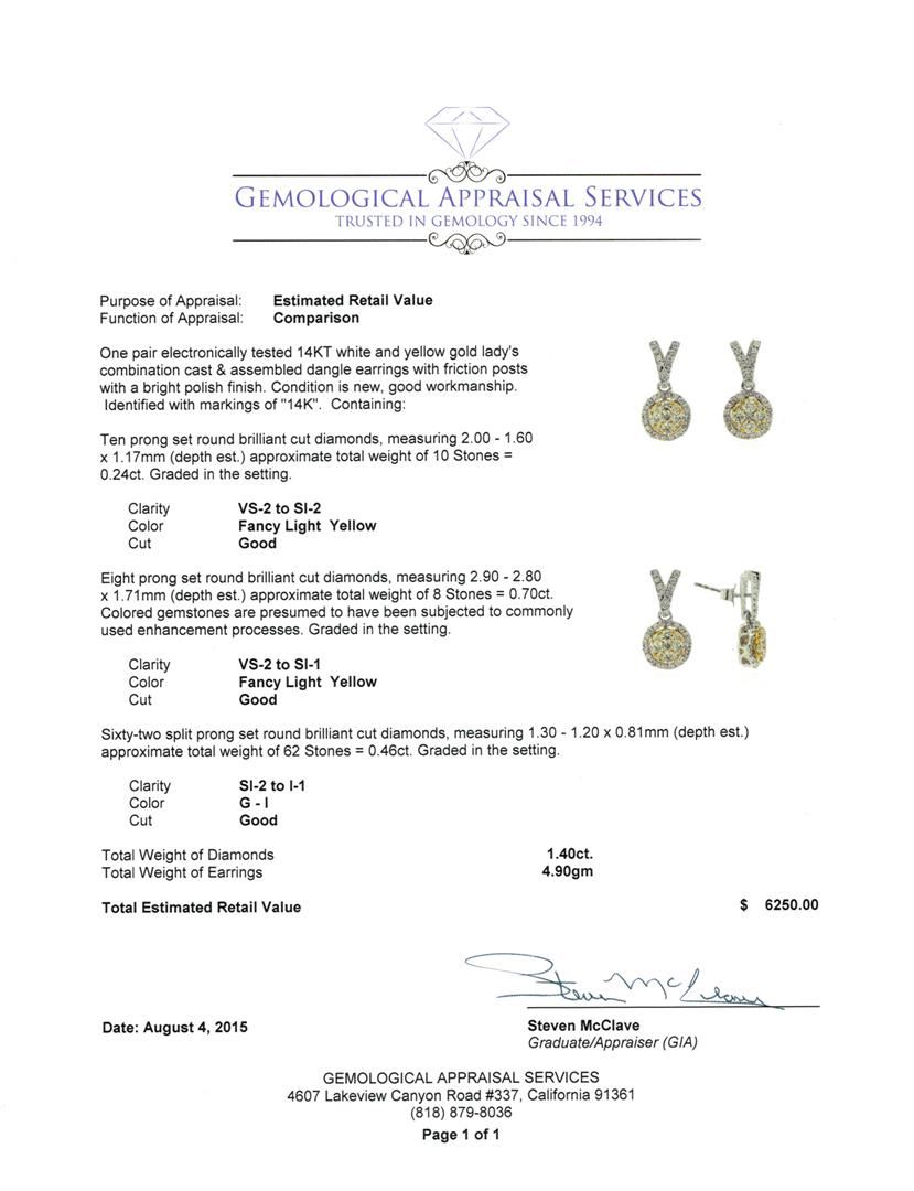 One pair electronically tested 14KT white and yellow gold lady's combination cast & assembled dangle earring with friction posts with a bright polish finish. Identified with markings of "14K". Condition is new, good workmanship. Containing: Ten prong set round brilliant cut diamonds, measuring 2.00 - 1.60 x 1.17mm (depth est.) approximate total weight of 10 Stones = 0.24ct. Graded in the setting. Clarity VS-2 to SI-2 Cut Good Eight prong set round brilliant cut diamonds, measuring 2.90 - 2.80 x 1.71mm (depth est.) approximate total weight of 8 Stones = 0.70ct. Colored gemstones are presumed to have been subjected to commonly used enhancement processes. Graded in the setting. Clarity VS-2 to SI-1 Cut Good Sixty-Two split prong set round brilliant cut diamonds, measuring 1.30 - 1.20 x 0.81mm (depth est.) approximate total weight of 62 Stones = 0.46ct. Graded in the setting. Clarity SI-2 to I-1 Color G - I. Cut Good Total Weight of Diamonds 1.40ct. Total Weight of Earring 4.90gm GAS Appraised at $6,250.00.