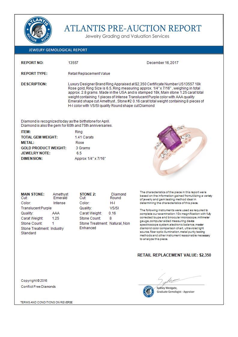 REF-35M3H -13557 ---- 1.41 CTW Amethyst & Diamond Ring 18K Rose Gold ---- Luxury Designer Brand Ring Appraised at $2,350 Certificate Number US13557 18k Rose gold, Ring Size is 6.5, Ring measuring approx. 1/4" x 7/16" , weighing in total approx. 2.8 grams. Made in the USA and is stamped 18k, Main stone 1.25 carat total weight containing 1 pieces of Intense Translucent Purple color with AAA quality Emerald shape cut Amethyst , Stone #2 0.16 carat total weight containing 8 pieces of H-I color with VS/SI quality Round shape cut Diamond