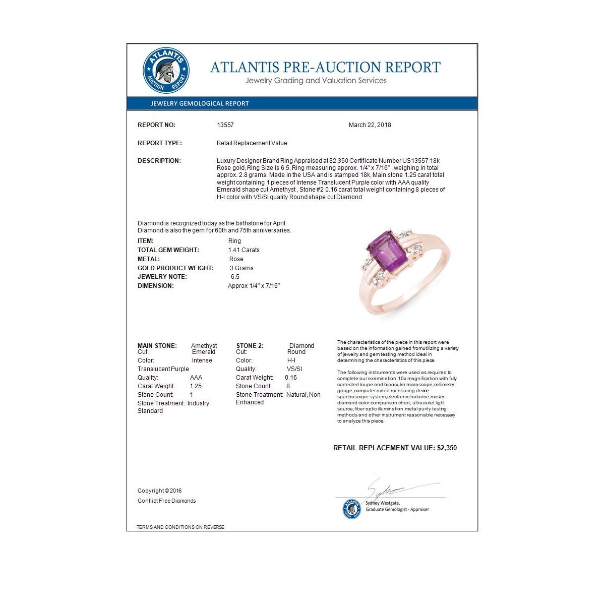 REF-35M3H -13557 ---- 1.41 CTW Amethyst & Diamond Ring 18K Rose Gold ---- Luxury Designer Brand Ring Appraised at $2,350 Certificate Number US13557 18k Rose gold, Ring Size is 6.5, Ring measuring approx. 1/4" x 7/16" , weighing in total approx. 2.8 grams. Made in the USA and is stamped 18k, Main stone 1.25 carat total weight containing 1 pieces of Intense Translucent Purple color with AAA quality Emerald shape cut Amethyst , Stone #2 0.16 carat total weight containing 8 pieces of H-I color with VS/SI quality Round shape cut Diamond