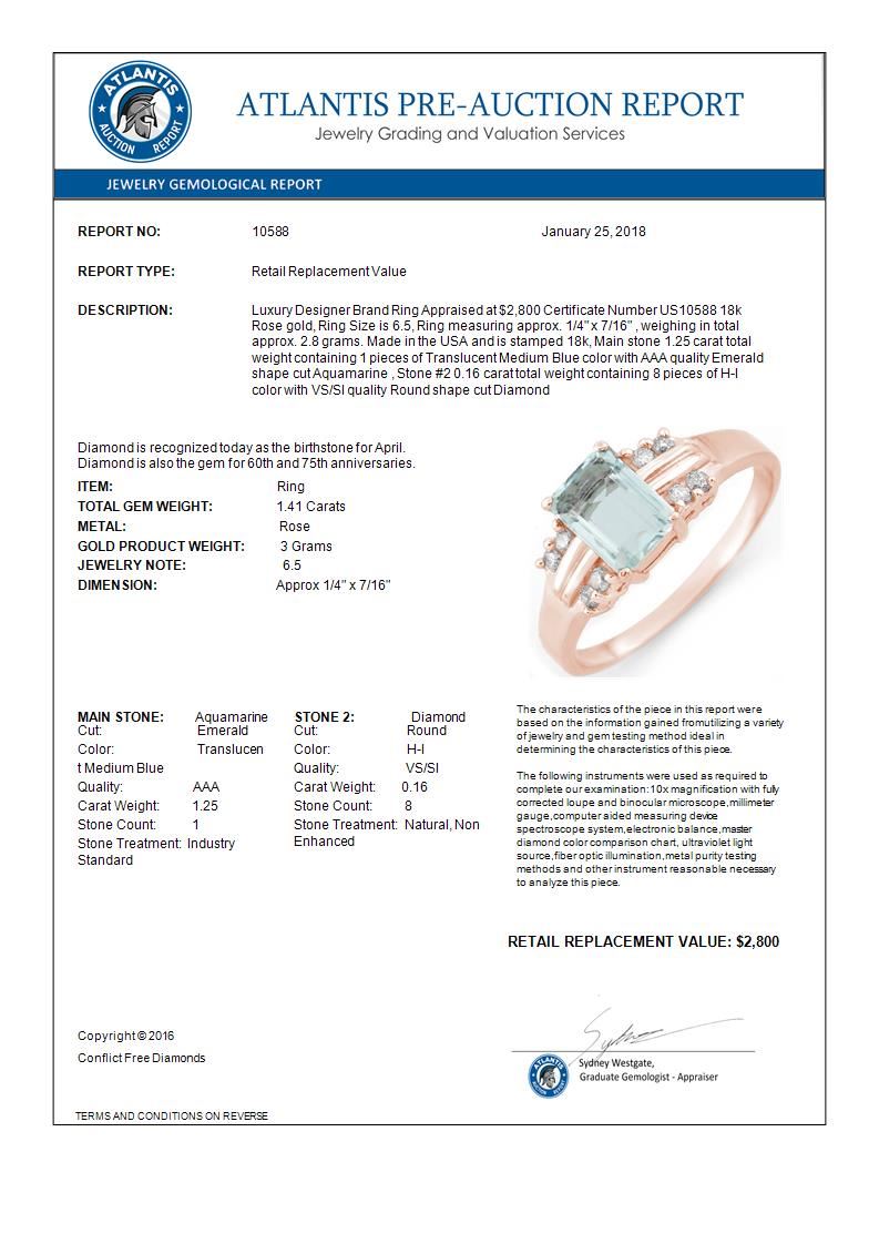 REF-42X8T -10588 ---- 1.41 CTW Aquamarine & Diamond Ring 18K Rose Gold ---- Luxury Designer Brand Ring Appraised at $2,800 Certificate Number US10588 18k Rose gold, Ring Size is 6.5, Ring measuring approx. 1/4" x 7/16" , weighing in total approx. 2.8 grams. Made in the USA and is stamped 18k, Main stone 1.25 carat total weight containing 1 pieces of Translucent Medium Blue color with AAA quality Emerald shape cut Aquamarine , Stone #2 0.16 carat total weight containing 8 pieces of H-I color with VS/SI quality Round shape cut Diamond